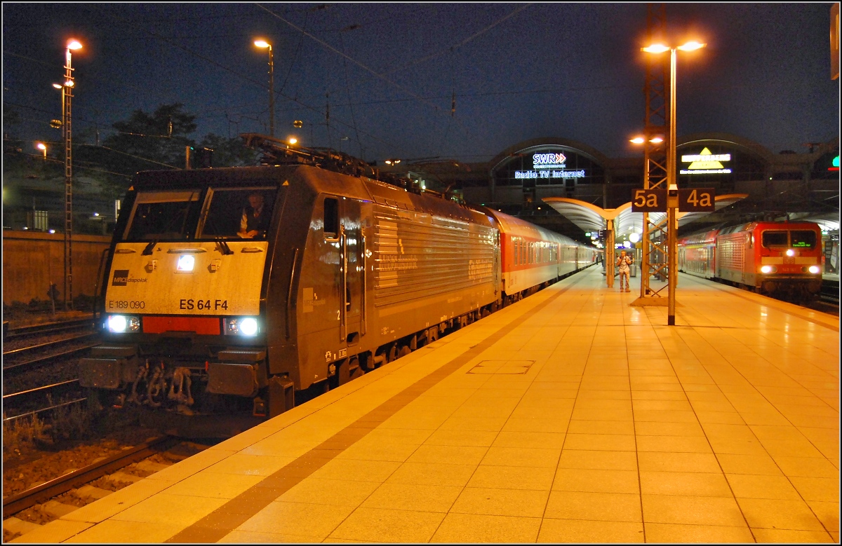 Die DB 110 262-5 mit dem D 358 von Berlin nach Basel SBB, welcher auch einen direkten Schlafwagen aus Moskau führt beim Halt in Basel Bad. Bf.