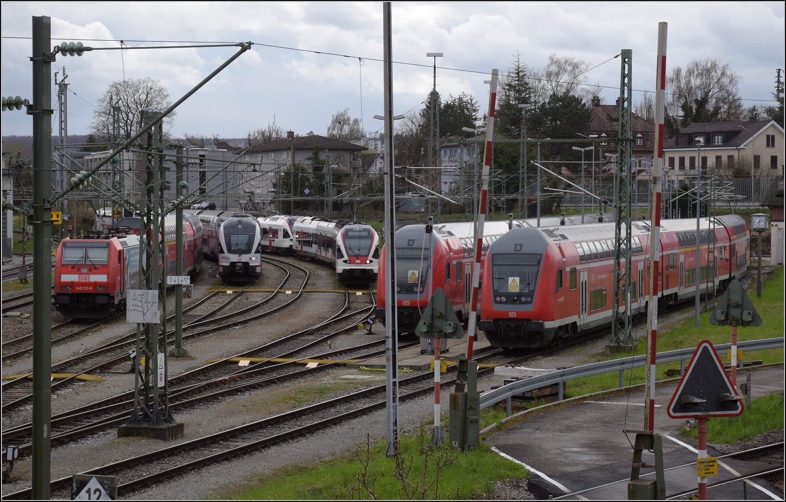 Die Abstellanlage des Bahnhof Konstanz auf Kreuzlinger Germarkung ist gut belegt. Von links 146 231 ohne einen streikenden Dosto-Steuerwagen, dafür mit 146 237(?) als Sandwich. 4010 005, versteckt RABe 521 208 'Singen', hintereinander RABe 521 203 und RABe 521 207, 146 239 und 146 230 jeweils mit Schwarzwaldbahnzug. März 2023.
