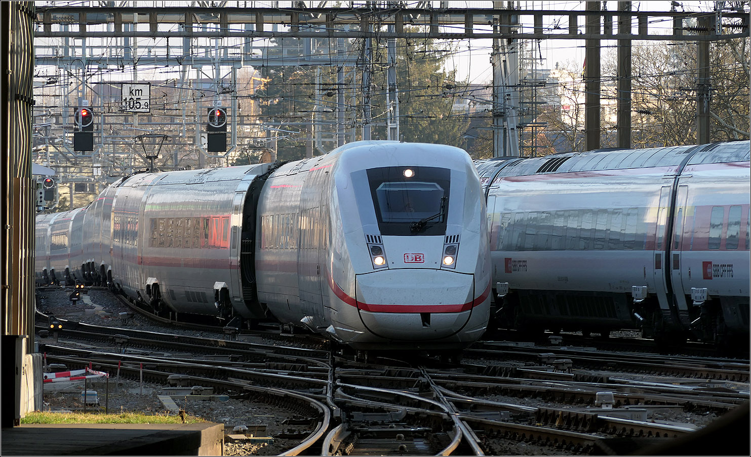 Zum Schluss noch ein Blick auf den jetzt auf Gleis 7 stehenden ICE 4, während auf Gleis 8 ein IC auf seine Abfahrt wartet.