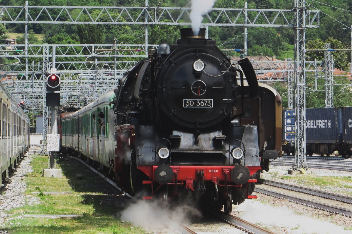 Grosse Frühlingsfahrt mit der Grossdampflok 503673 vom 11. März 2015. Die Nostalgielok Be 4/4 Nr. 14 ex BT brachte den Sonderzug bis nach Olten Hammer, wo er durch die 50673 übernommen wurde. Die Be 4/4 14 wurde am Schluss des Zuges angehängt, um Umfahrungen zu vermeiden. Beim Wasserfassen in Lyss kam es zu einer Begenung mit der 01 202. Diese Aufnahme wo die 503673 geschleppt wird, ist bei Busswil entstanden.