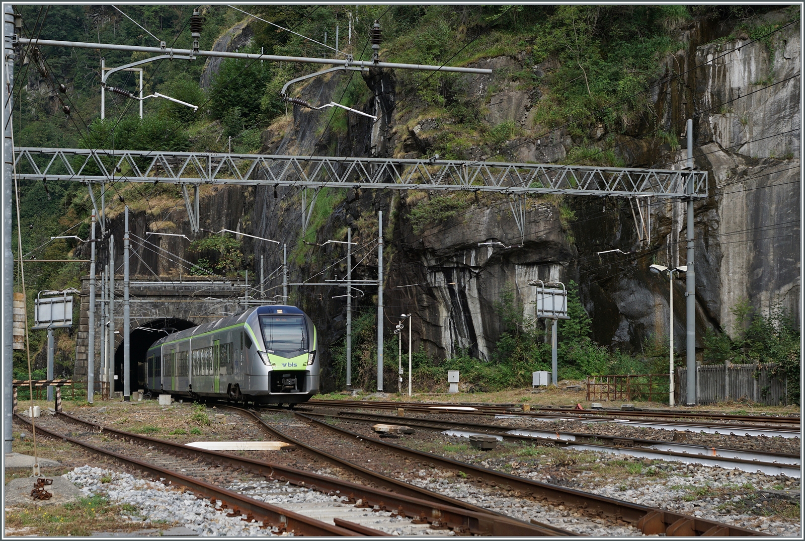 Von der (ehemaligen) Güterrampe in Iselle di Trasquera ein Blick auf den Bahnhof mit dem hier wendenden BLS RABe 528 102 (infolge SEV Iselle - Domo). Es war fotografisch gesehen von Vorteil, dass die Reisezüge auf Gleis 3 an- und abfuhren.