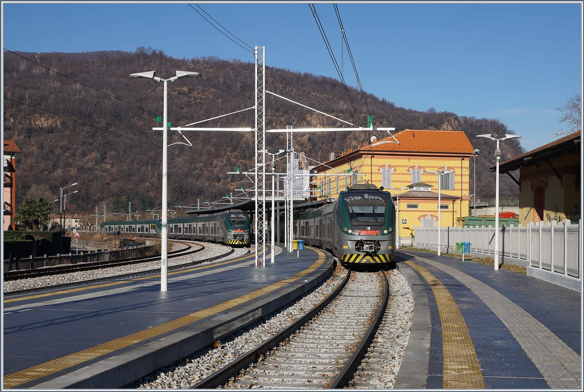 Zwei gekuppelte JAZZ der Trenord, der fünfteilige ETR 425 040 und der sechsteilige ETR 526 008, stehen am 19.02.2017 im FS Bahnhof Tirano.