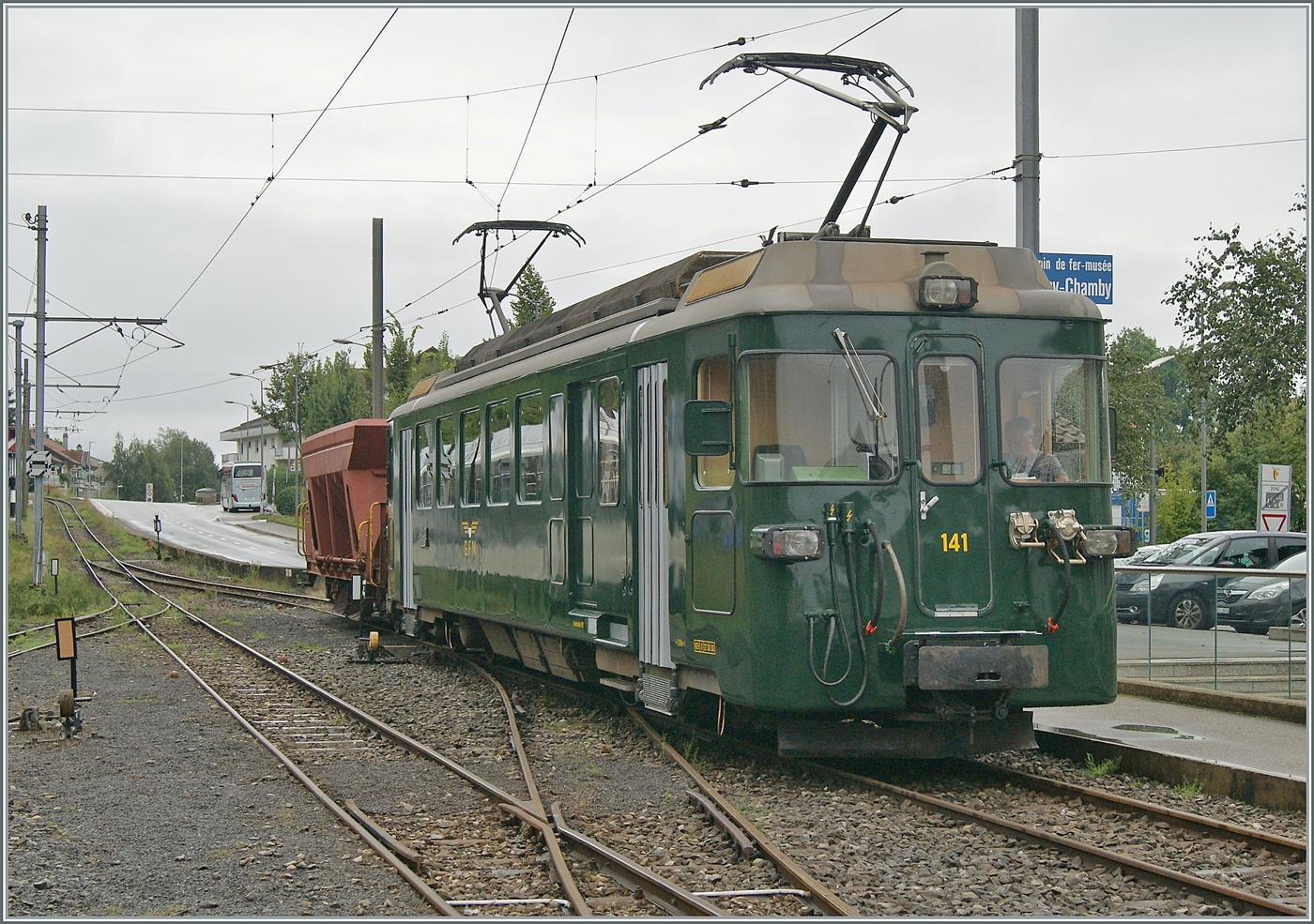Das Bild zeigt den BDe 4/4 141 in Blonay nach der Ankunft aus Chaulin.