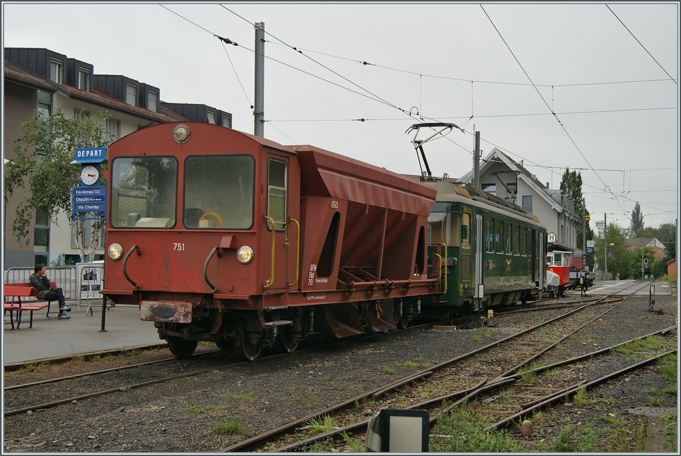 Autour de la voie ferrée / Rund um die eiserne Bahn (Herbstevent 2024) - Für den Kiestransport beschaffte die GFM im Jahre 1972 die beiden Treibwagen mit der Bezeichnung BDe 4/4 141 und 142. Die Triebwagen kamen mit Kieszügen mit einem Steuerwagen zum Einsatz. Später fuhren sie mit Pendelzügen im Regionalverkehr der GFM und TPF, jeweils in der damals aktuellen Farbgebung. "GFM Histoique" arbeitete ihren BDe 4/4 141 auf und zeigt ihn in der ursprünglichen Farbgebung. Durch die recht moderne Formgebung und die 1972 doch eher altgediente Farbgebung bietet der BDe 4/4 141 einen besonders kontrastreichen Reiz. Unter dem nun folgenden Link kann man sehen, wie sich der BDe 4/4 141 mit seinen Kieswagen wenige Jahre nach der Ablieferung zeigte: https://igschieneschweiz.startbilder.de/bild/schweiz~bahnhoefe~bulle/864431/triebwagen-141-der-einstigen-gruy232re-fribourg-morat-bahn.html Das Bild zeigt den BDe 4/4 141 in Blonay, beim Abwarten eines Gegenzuges. 7. September 2024