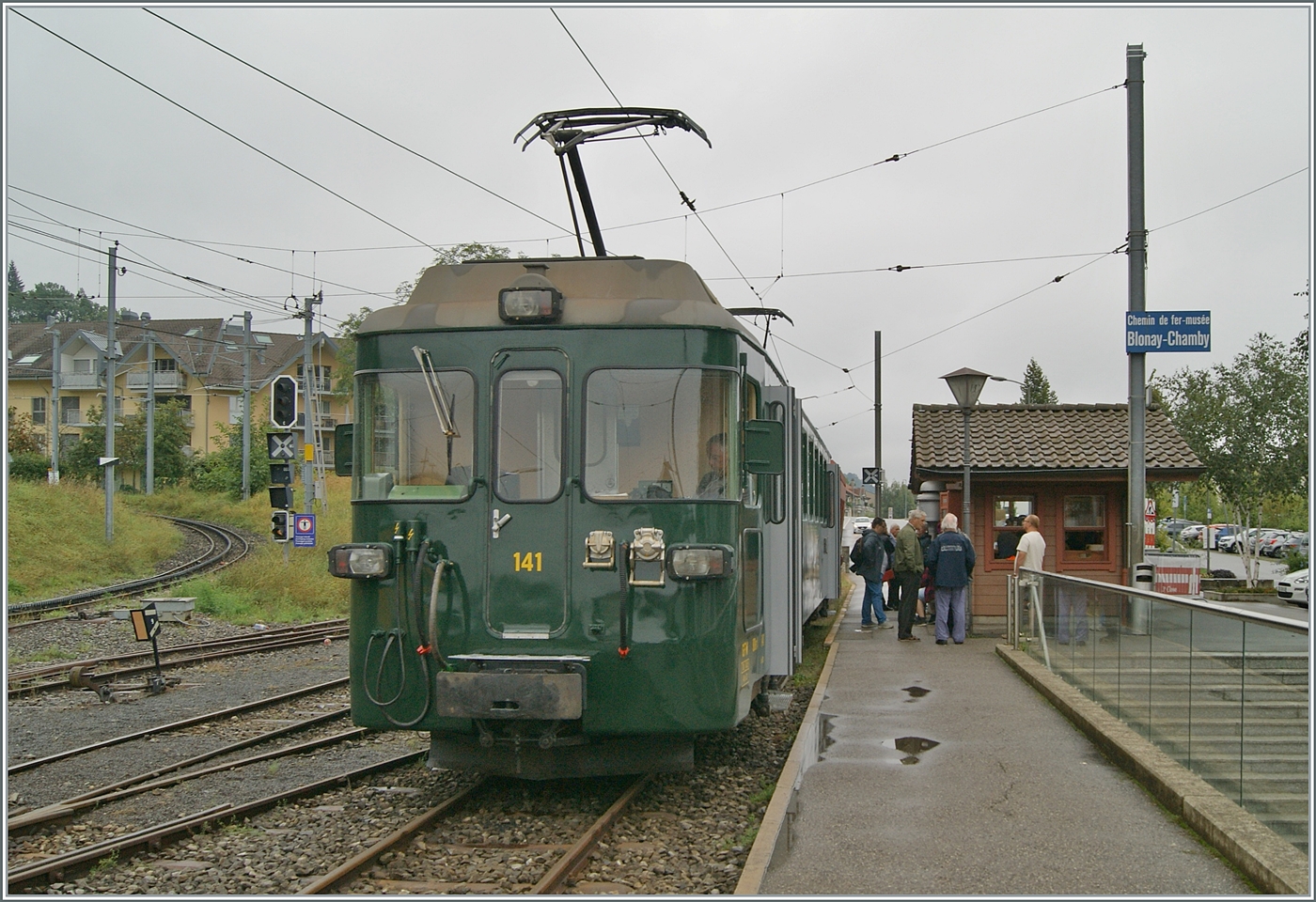 Das Bild zeigt den BDe 4/4 141 in Blonay, beim Abwarten eines Gegenzuges.
