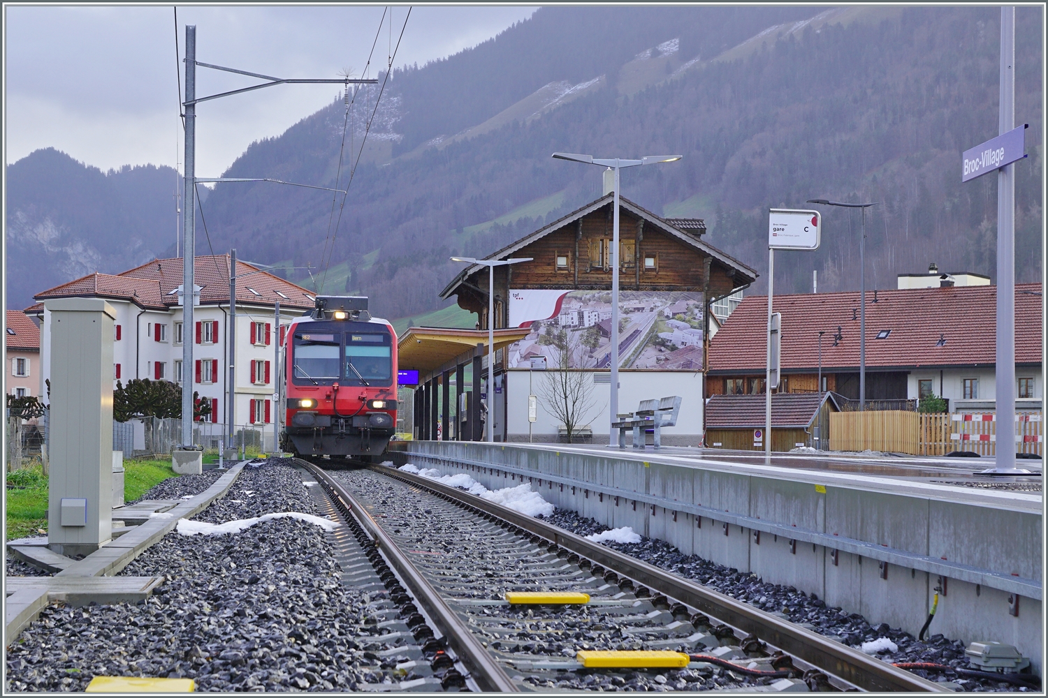 Broc Village mit Blick auf den Prellbock und die "Strecke" nach Broc Farbrique.