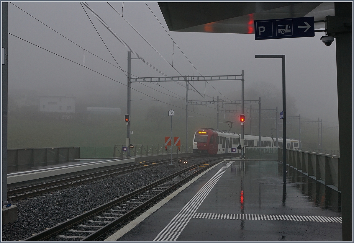 Ein TPF SURF ABe 2/4 - B - Be 2/4 verlässt Châtel-St-Dennis in Richtung Bulle, im Hintergrund ist der neue Bahnhof im Bau.