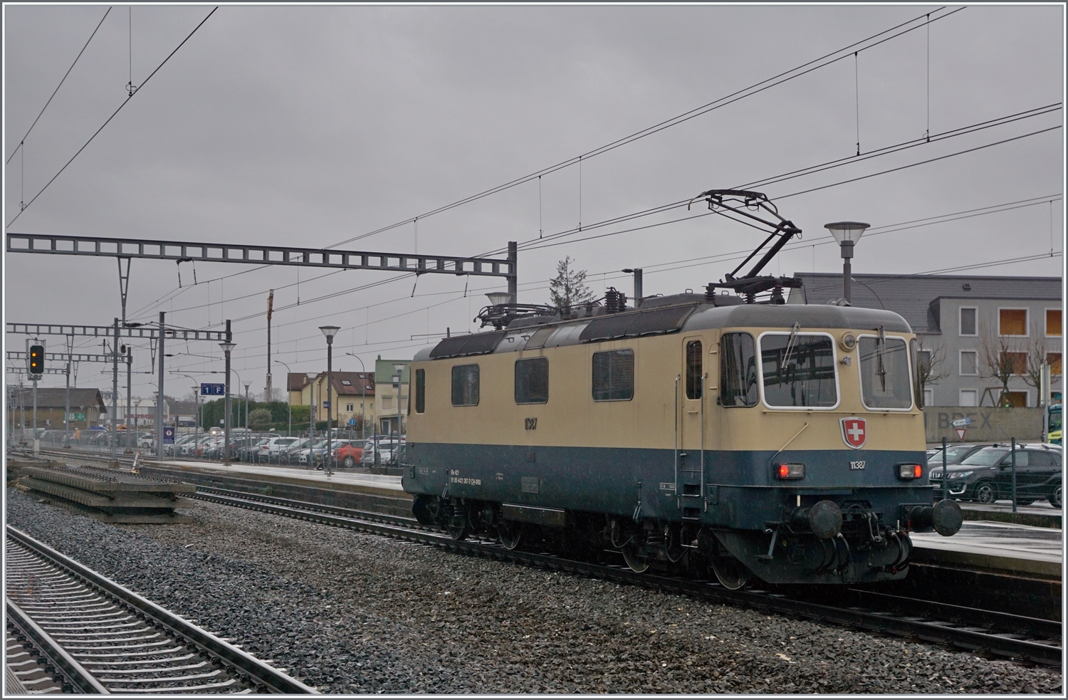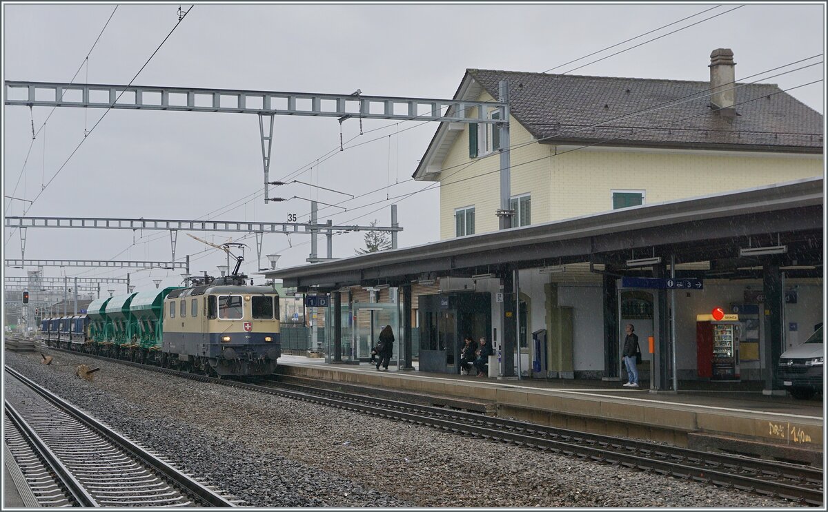 Die IRSI/IGE "Rheingold" Re 4/4 II 11387 (Re 421 387-2) im Dienste der BAM MBC verlässt mit ihrem Kieszug nach Apples das Industriegelände bei Gland.