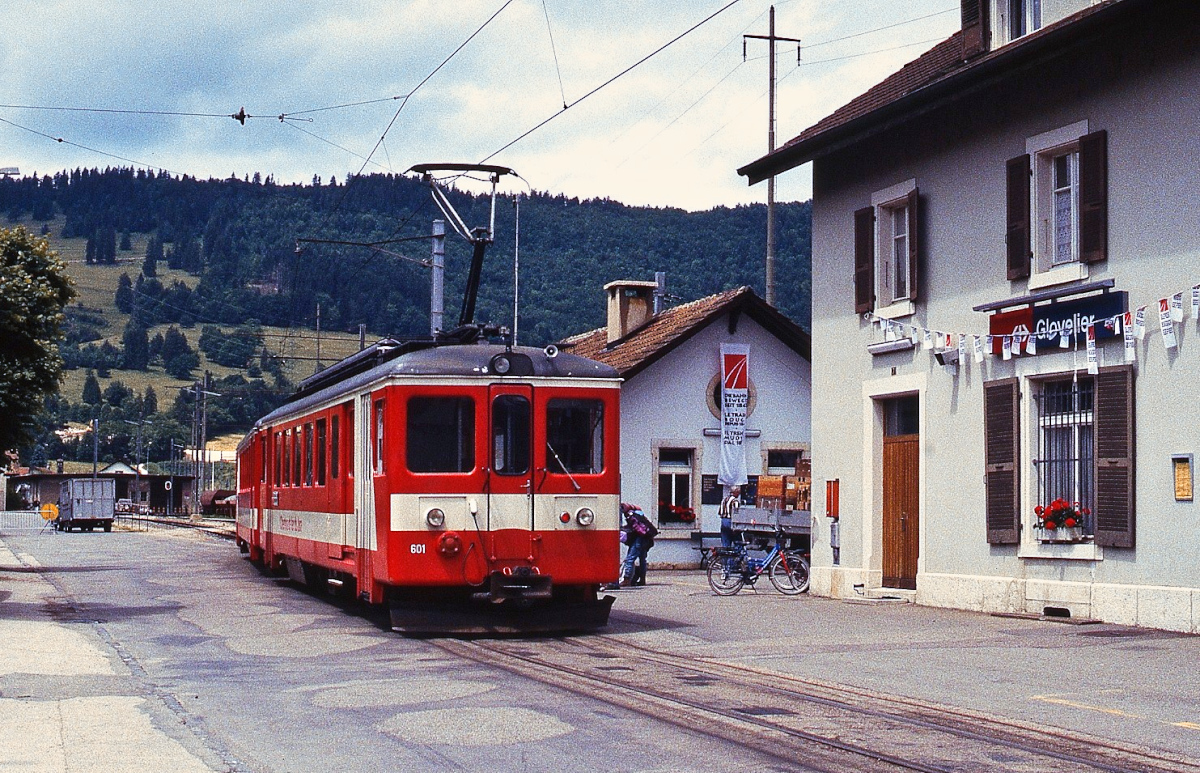 Nachdem Stefan hier einige Bilder der  alten  und  neuen  Abfahrtsstelle der CJ in Glovelier gezeigt hat, möchte ich das mit einigen Fotos aus dem Sommer 1997 ergänzen: BDe 4/4 I 601 auf dem Bahnhofsvorplatz