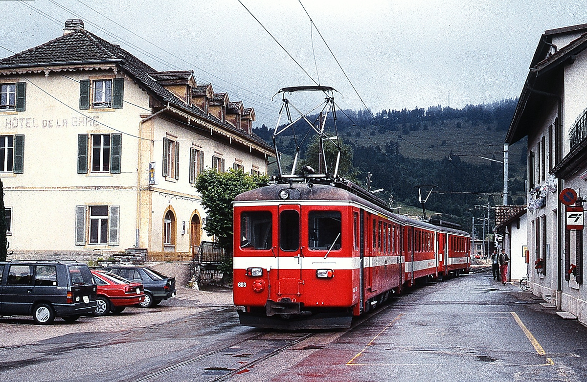 Ziemlich eng ging es auf dem Bahnhofsvorplatz in Glovelier zu: Im Sommer 1997 steht ein CJ-Zug nach La-Chaux-de Fonds, am Zugschluss BDe 4/4 I 603, zwischen dem Hotel de la Gare und dem Bahnhofsgebäude