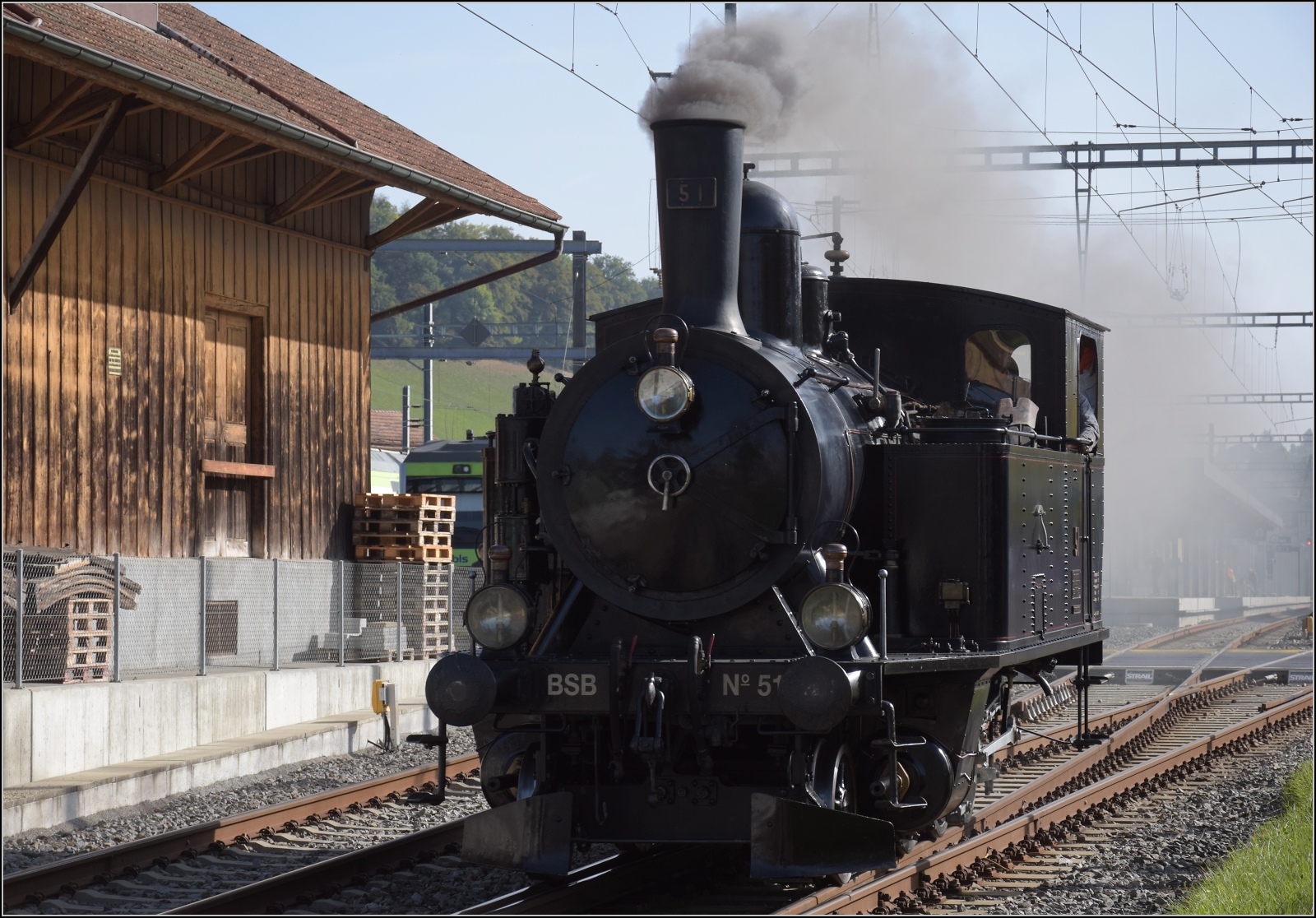 Huttwiler Dampftage. Ed 3/4 51 der Bern-Schwarzenburg-Bahn auf Rangierfahrt in Huttwil. Dampflokfans sind offenbar nicht ausschließlich Zweibeiner, wie man bei genauer Betrachtung des Bildes erkennt. Oktober 2023.