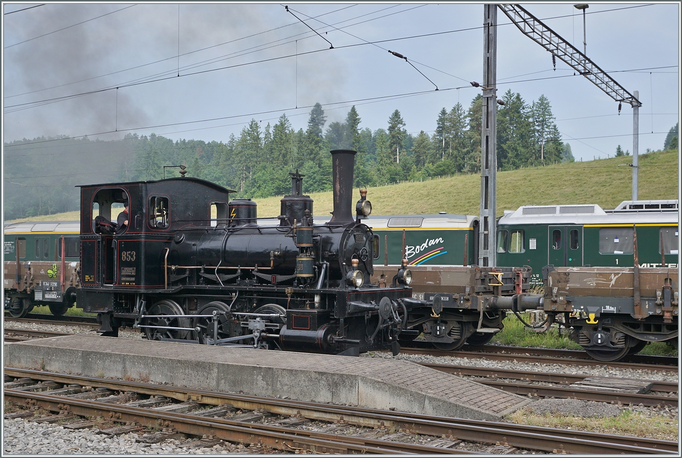 In Sumiswald findet der traditionelle Gotthelf-Märit statt und für diesen Markt fährt die "Emmentalbahn" auf der Strecke Sumiswald Grünen - Wasen i.E. einige Dampfzüge. Das Bild zeigt die E 3/3 853 des Vereins Dampf Bahn Bern beim Umfahren in Sumiswald Grünen.