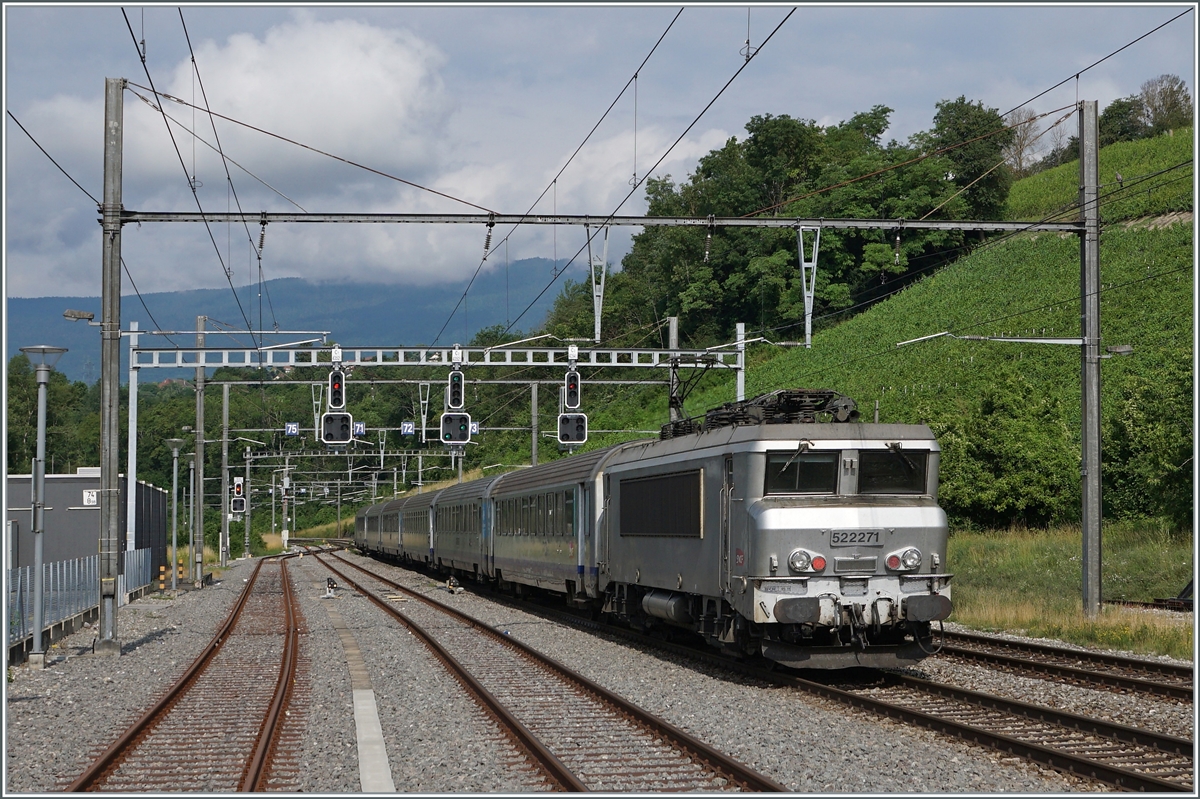 Ein Bahnhof grenzt sich von der Strecke durch seine Einfahrsignale ab und so reicht der Bahnhof von La Plaine noch ein paar hundert Meter nach Frankreich hinein, wobei die hier zu sehende Signale die Strecke in Richtung Pougny abdecken, das rechte jedoch nur "Rot" zeigen kann. Die SBB Einfahrsignale von La Plaine sind noch ein paar meter weiter westlich und mehr zu erahnen als zu erkennen. Ebenfalls befindet sich hier die Trennung der Stroms zwischen Strecke und Bahnhof und wohl folglich auch auch zwischen SNCF und SBB, wobei die Strecke bis Genève mit 25000 Volt 50 Hertz Wechselstrom versorgt wird.