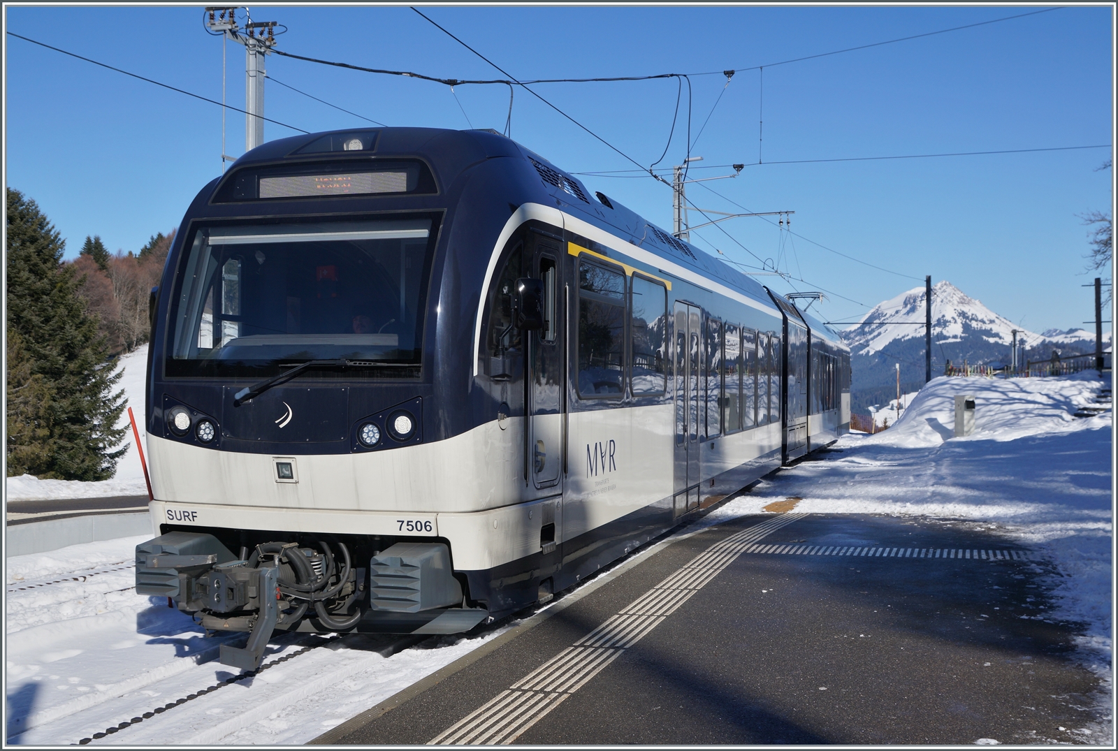 Der CEV MVR GTW ABeh 2/6 7504 "VEVEY" verlässt Les Pleiadaes Richtung Vevey. Im Hintergrund sieht man das "Stellwerk" für die einzige Weiche des Bahnhofs, welche bis vor kurzem eine Handweiche war.