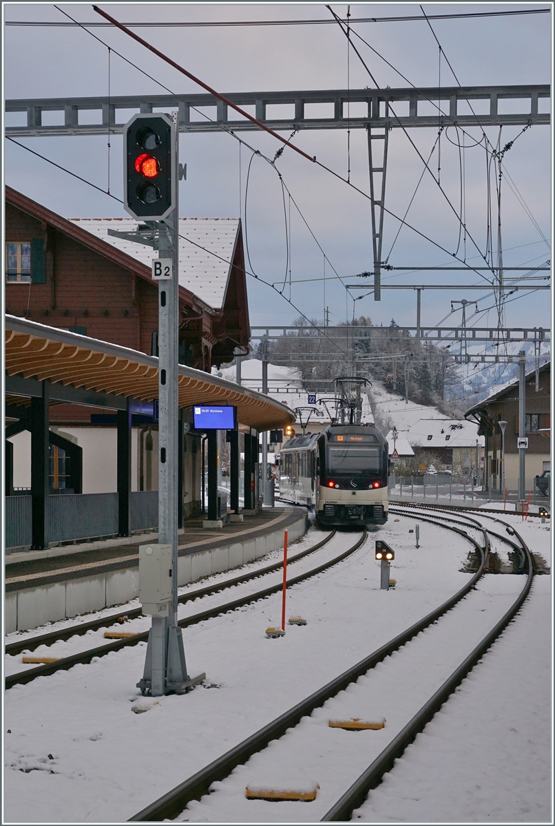 Der ABe 2/4 - B Be 2/4 104 wartet in Montbovon auf die Abfahrt als S50 nach Palézieux.
