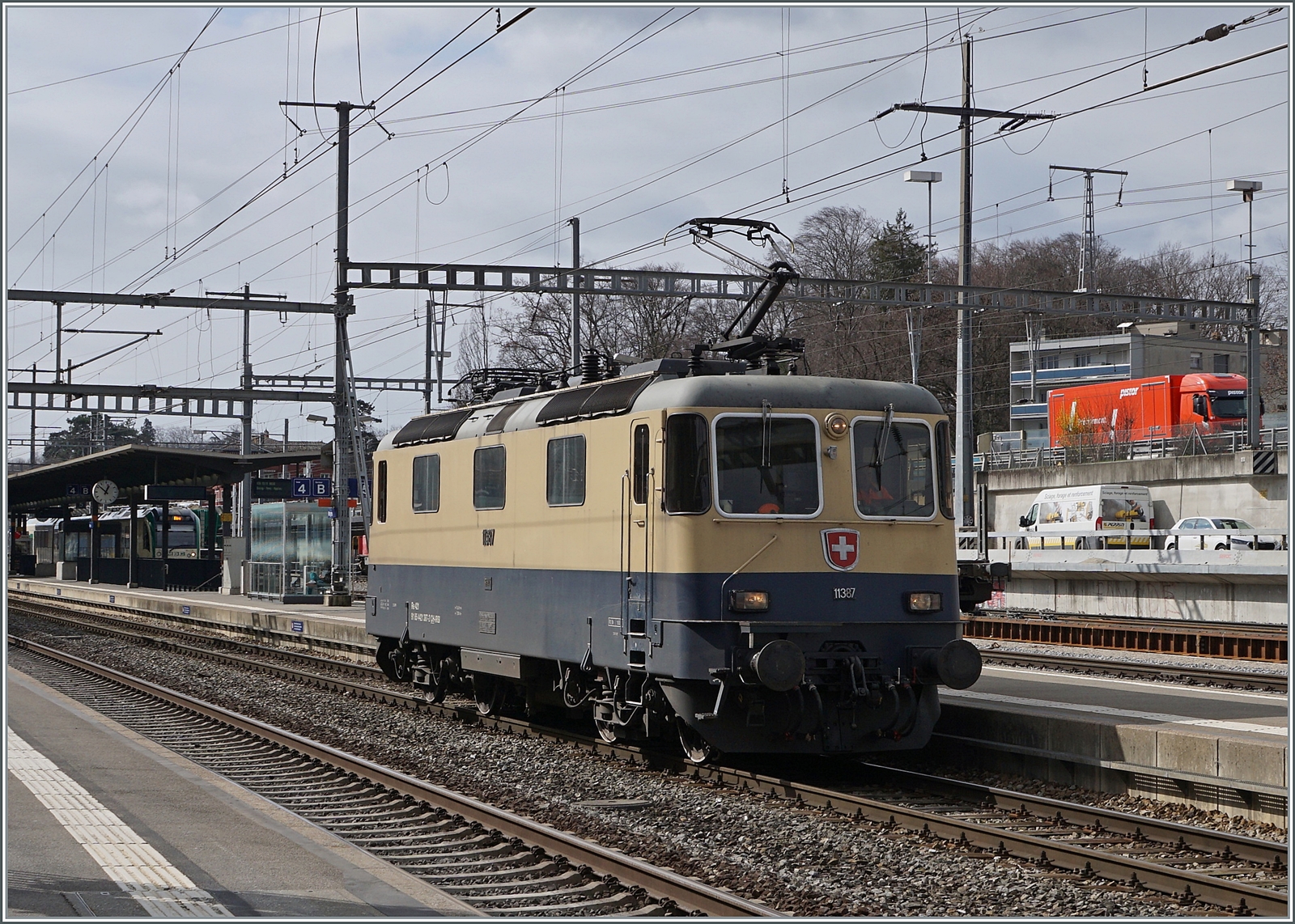 SBB/MBC: Die SBB CARGO Eem 923 001-2 brachte am 13. August 2015 ab dem Rangierbahnhof Lausanne-Triage Güterlast nach Morges mit dem Bestimmungsort Biére. Für den Weitertransport mit der MBC mussten die Wagen auf Rollböcke verladen werden.