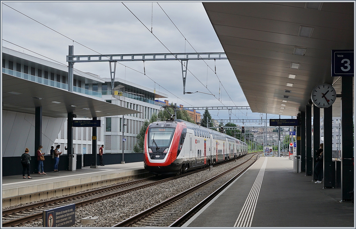 Der Tilo Flirt RABe 524 009 (ETR 524/ UIC 94 85 2 524 009-9) wirkt in der Umgebung des modernen Bahnhofs von Prilly-Malley schon nicht mehr so Taufrisch. 10. Juli 2015