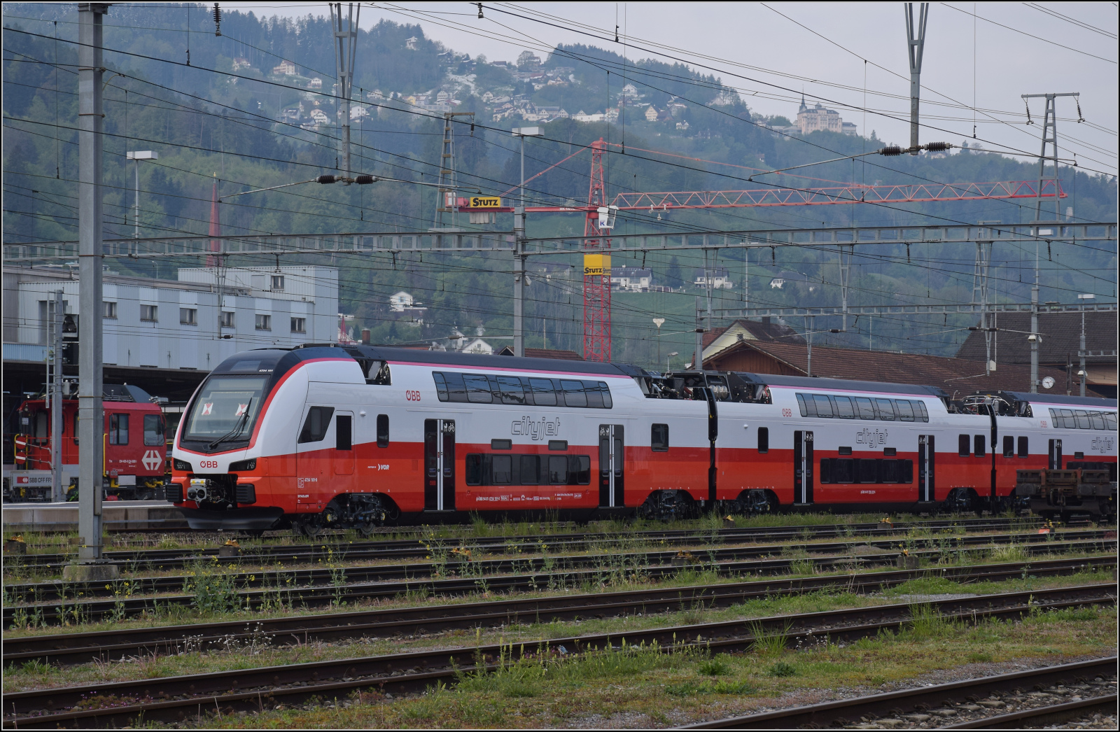 S-Bahn Verkehr in St.Margrethen: SOB RABe 526 056-7 als S 4 nach Sargans und ÖBB 4024 023-6 der Voralberger S-Bahn nach Bregenz.