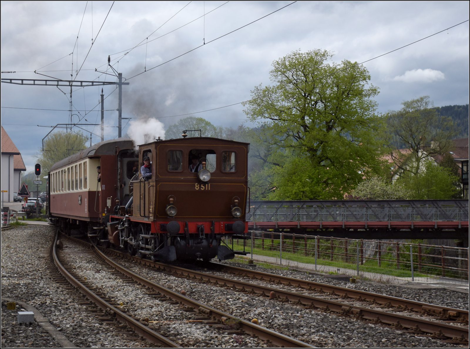 Train du Terroir. Vor dem Streckenumbau noch eine Besichtigungstour im Val Travers. Die E 3/3 5811 in Couvet. Mai 2024. Bei den ersten sechs Bildern bitte ich um Entschuldigung wegen einer versehentlichen starken Unterbelichtung, deren Behebung eine weniger gute Qualität bedingen. Ich fand sie aber trotzdem stimmungsvoll genug...