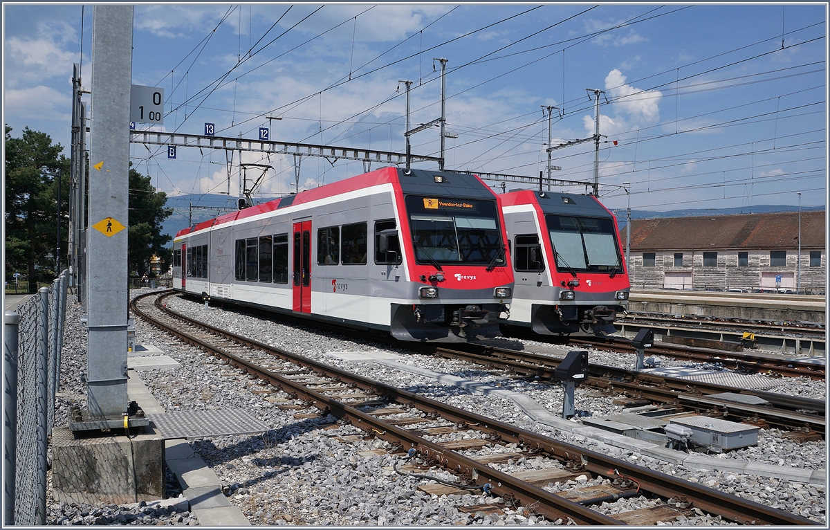 Der TRAQVY BDe 4/4 N° 1 steht im Dépôt von Yverdon, während rechts im Bild die Am 841 008-6 vorbeifährt.