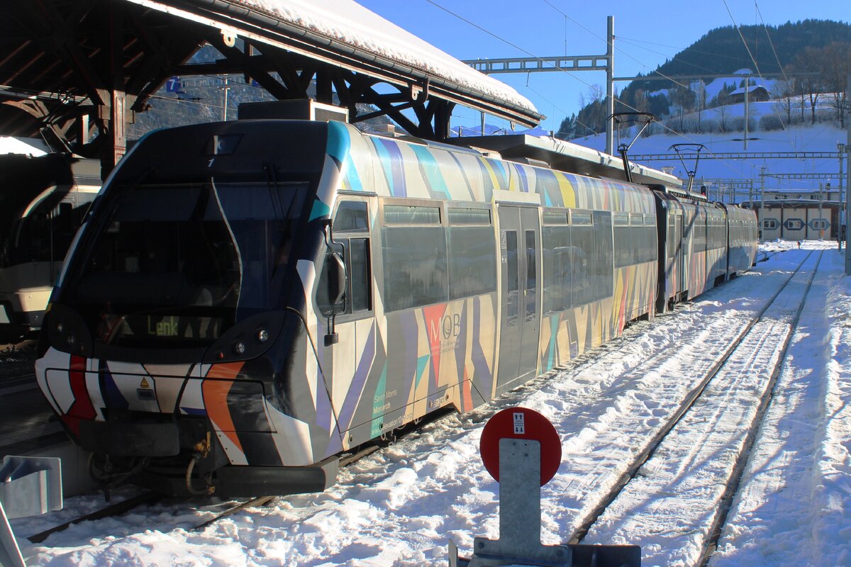 Ein BLS "MIKA" RABe 528 nach Bern zwischen zwei Lenkerpendel Be 4/4 (Serie 5000) in Zweisimmen. Während der Zug rechts im Bild in die Lenk fahren wird, ist der andere Links im Bild zur Enttäuschung der Kunden der "Panoramic Express nach Montreux".