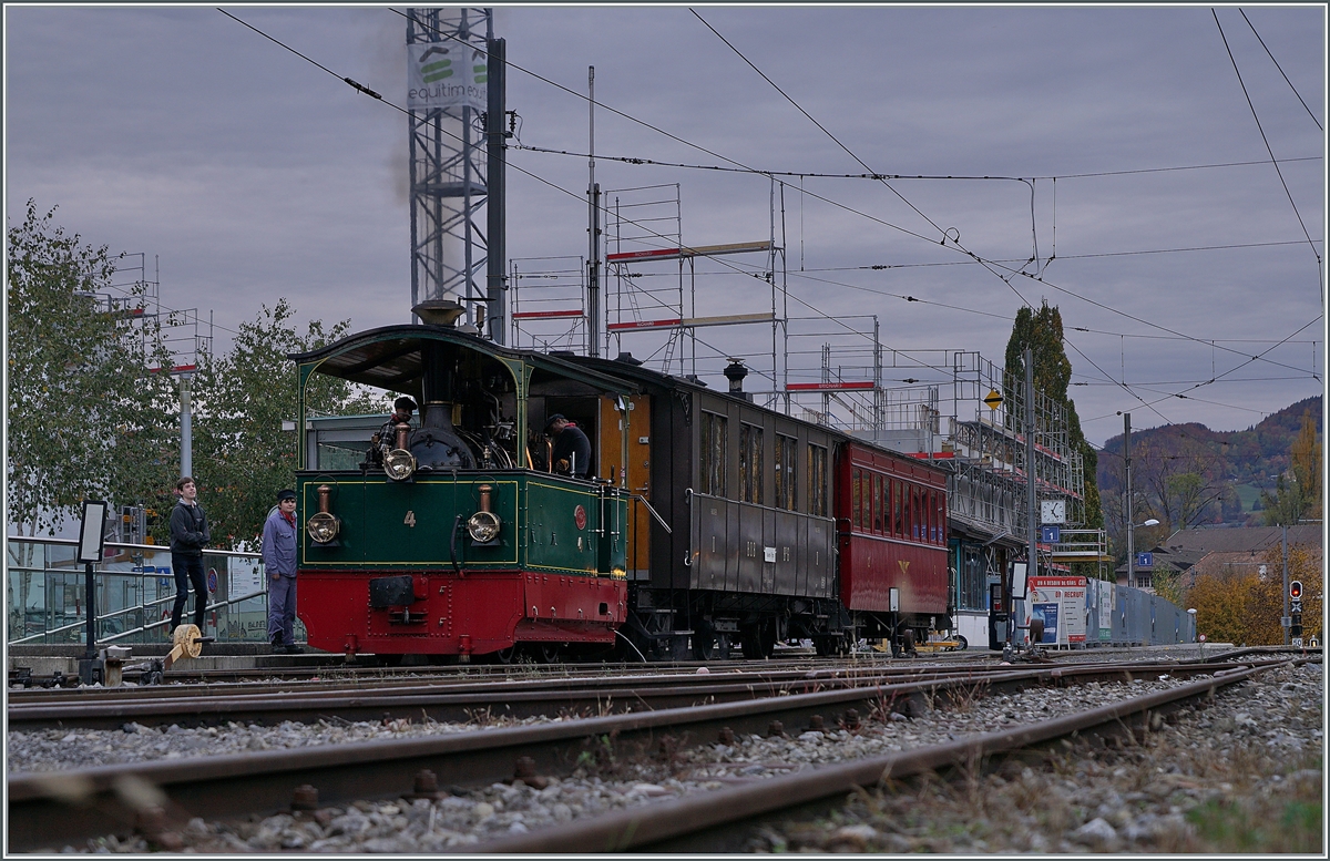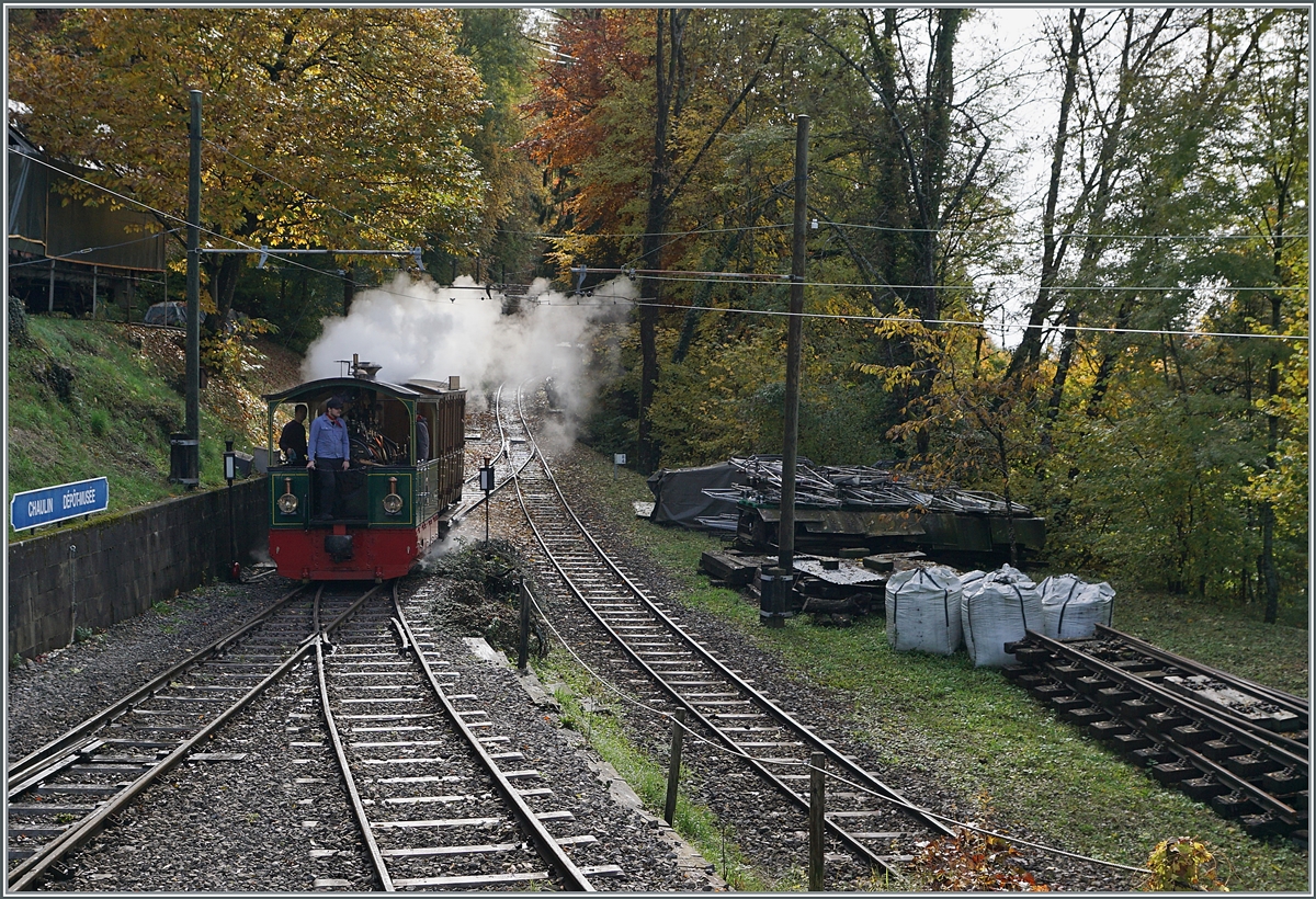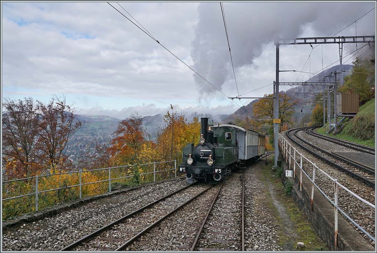"LA DER 2020 du Blonay-Chamby" / Saison Abschluss der Blonay-Chamby Bahn: Mit einem verstärkten Fahrplan und viel Dampf wird vor dem "Winterschlaf" nochmals viel Betrieb gemacht. Im Bild ein wahres Bijou welches die G 2/2 N° 4 "Rimini" von Chaulin nach Chamby schob: Der Aigle - Leysin CF2 N° 21 (Baujahr 1900 / SIG). Dieser Zug pendelte einige Male zwischen Chaulin und Chamby hin und her, um Museumsbesucher, welche mit der MOB an- oder abreisten, einen guten Anschluss zu bieten.