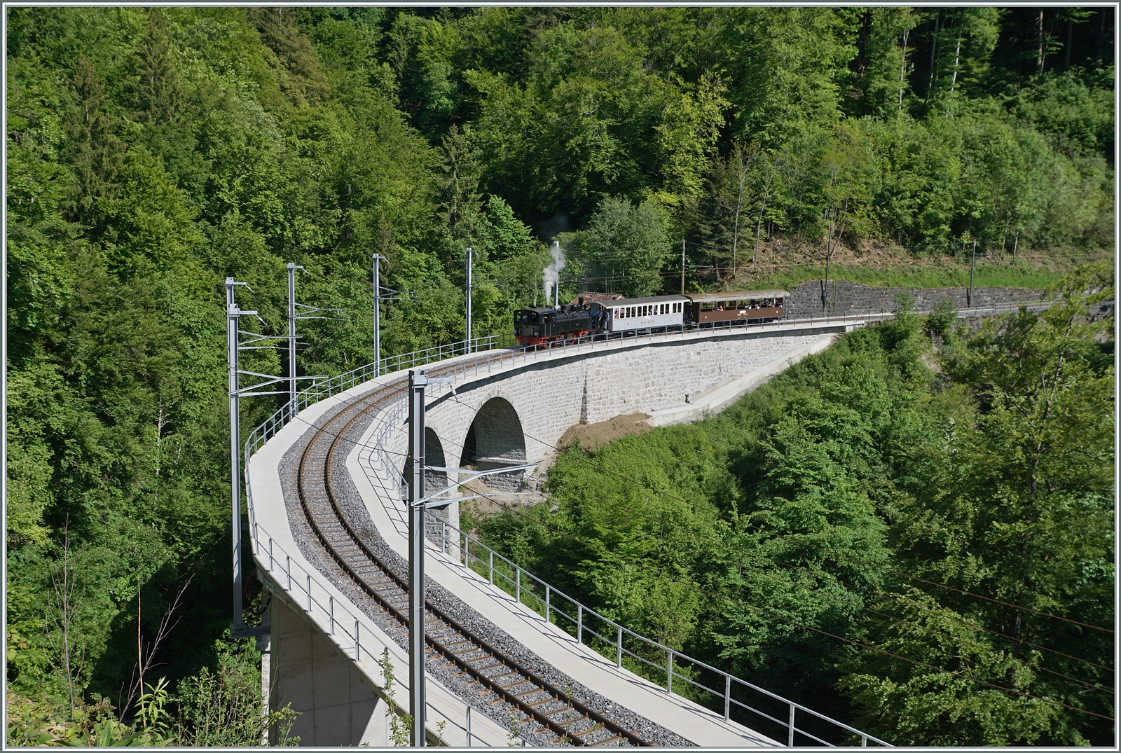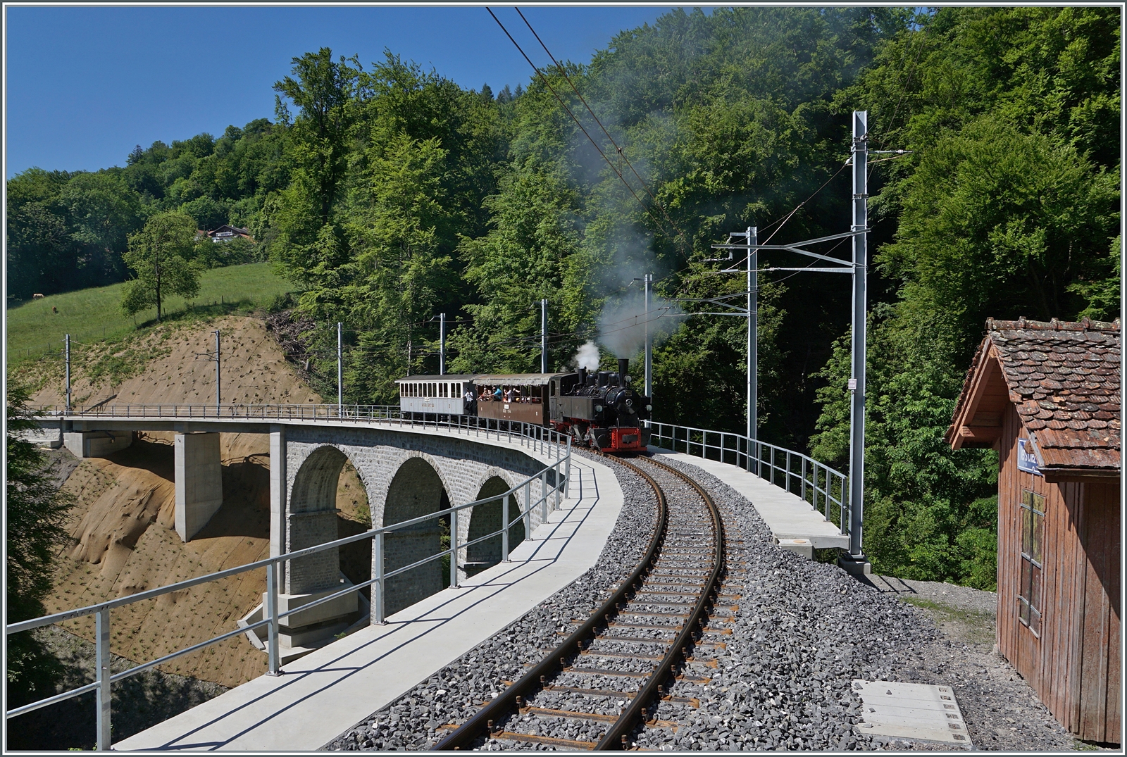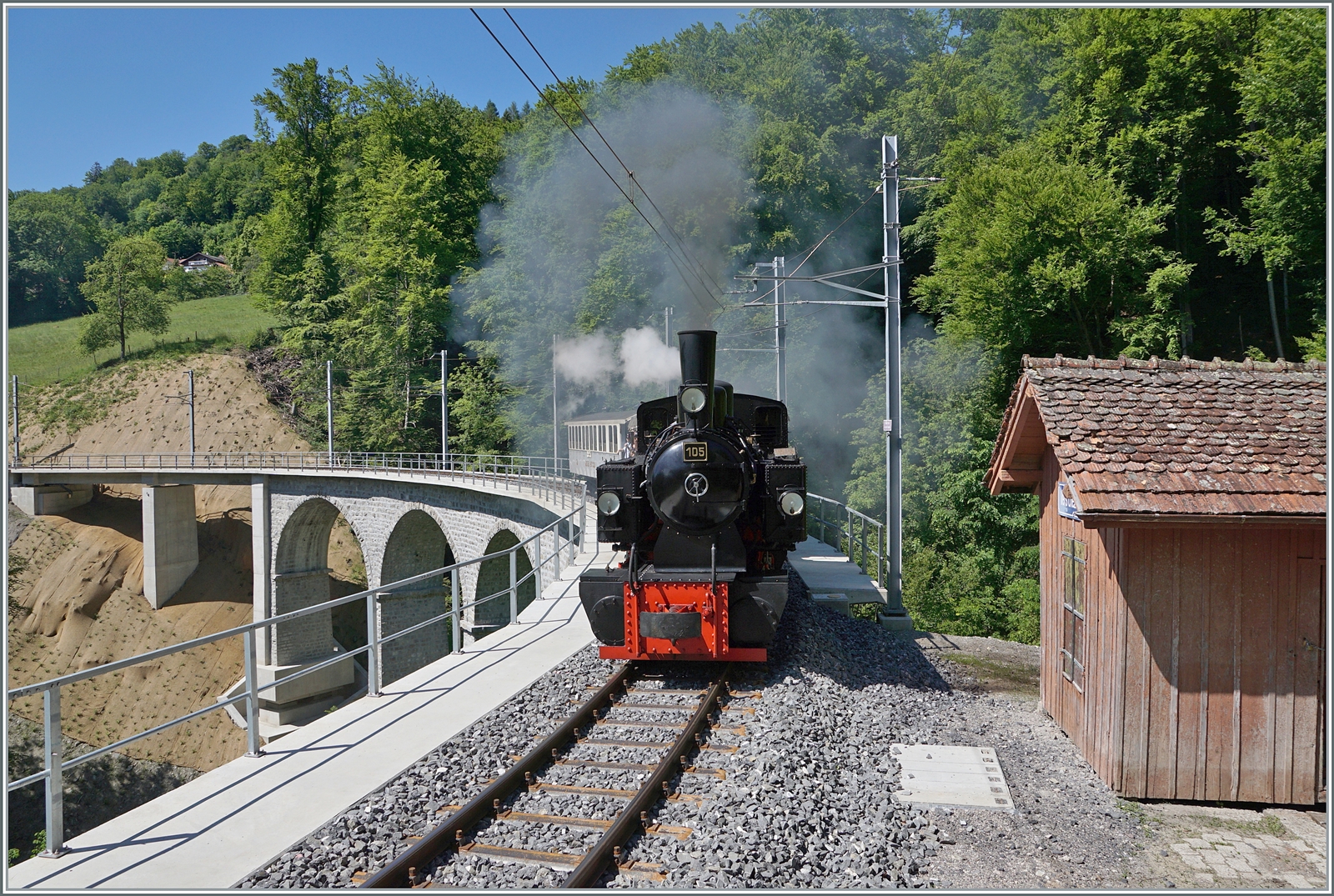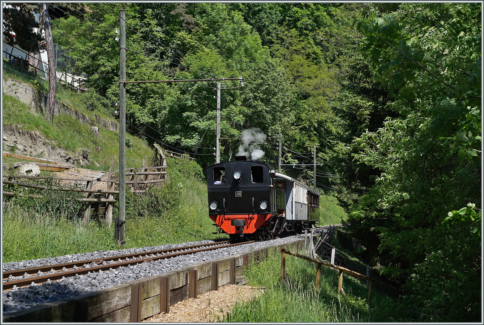Die eigenwillig zusammengesetzte Komposition ergab dann in Vevey ein herliches "Kaisermanöver; im Bild die LEB G 3/3 N° 5 (Baujahr 1890) in Wartestellung und die den "Riviera Belle Epoque" rangierende G 2x 2/2 105.