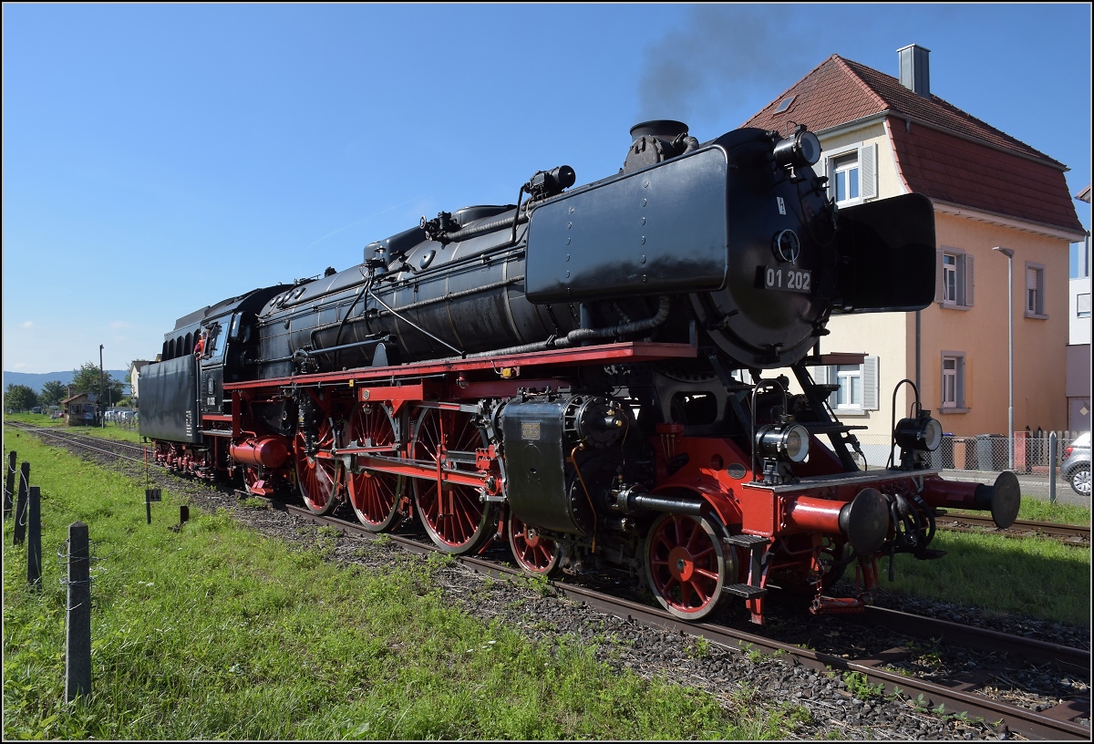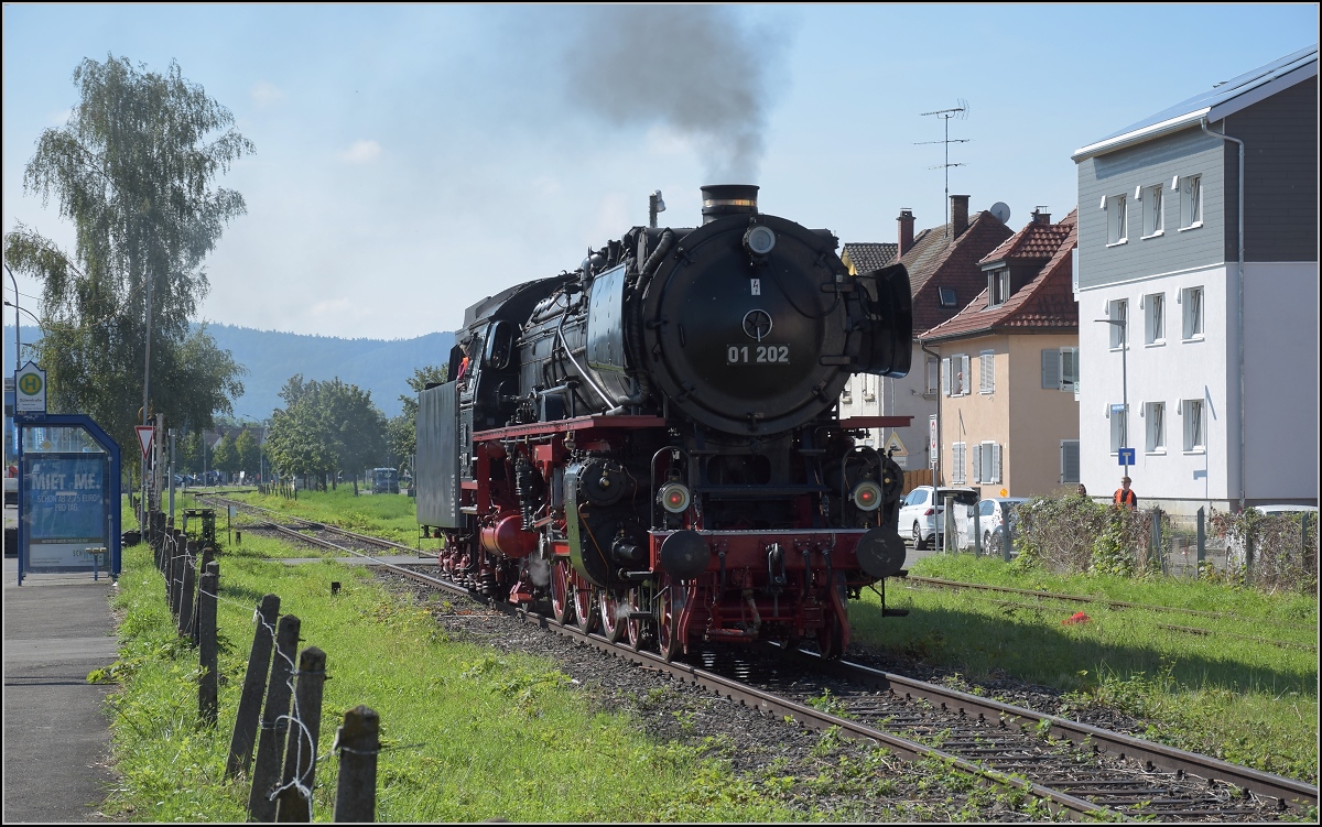 Endlich wieder Züge auf dem Schweizerbähnle (Etzwilen-Singen). Der große Moment, 01 202 bestreitet die erste Fahrt im Kreisverkehr auf dem neuen Gleis, der Lückenschluss kann jetzt befahren werden, die Strecke ist von der Kreisverkehrswacht mustergültig abgesperrt. Singen, August 2020.