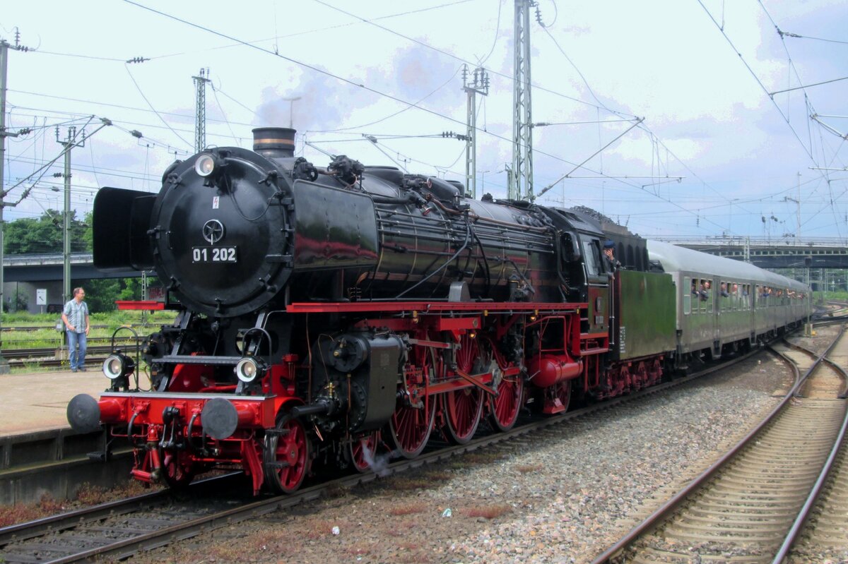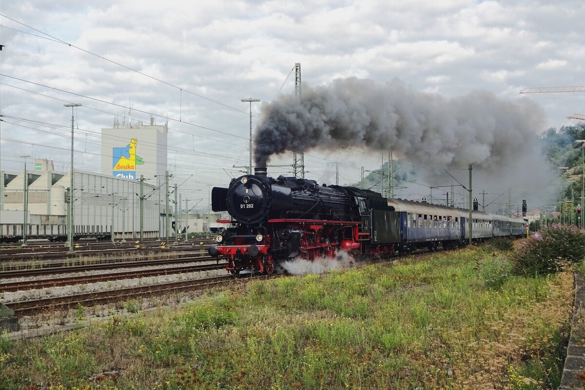 Endlich wieder Züge auf dem Schweizerbähnle (Etzwilen-Singen). 01 202 auf den Weg zum im Vorfeld vielzitierten Kreisverkehr mit neuverlegtem Gleis, der Lückenschluss wird nun getestet. Singen, August 2020.