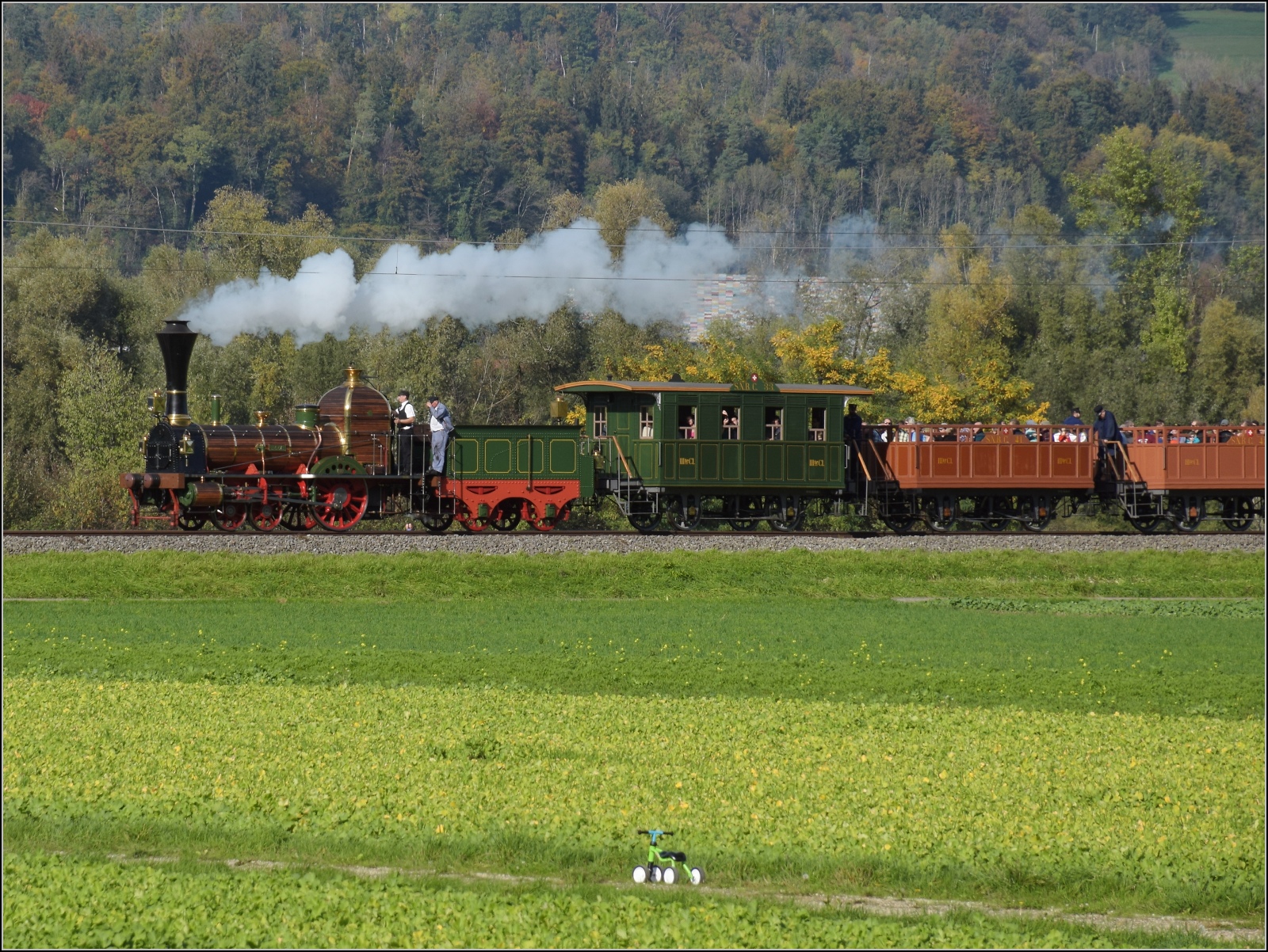 175 Jahre Spanisch-Brötli-Bahn. Entlang der N13 bei Schwaderloch. Im Hintergrund ist der Hotzenwald, südlichster Ausläufer des Schwarzwalds. Oktober 2022.