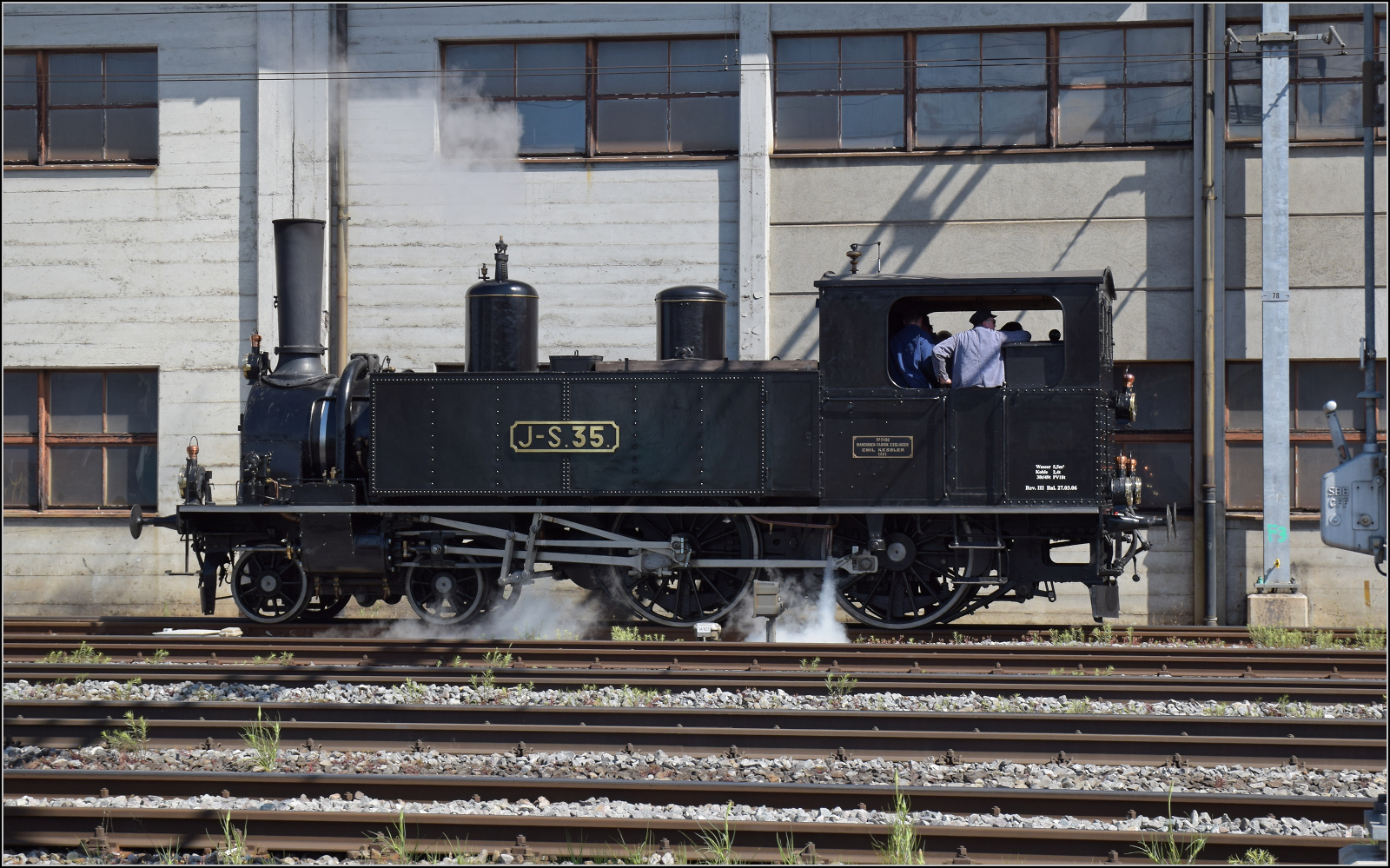 150 Jahre Emmentalbahn. Eb 2/4 35 der Jura-Simplon fährt auf dem Weg nach Burgdorf durch Gerlafingen am Stahlwerk vorbei, einem Einnahmengaranten der Emmentalbahn und genaugenommen Keimzelle, denn von hier gingen die ersten Gleise einer Pferdebahn die Emme entlang nach Derendingen. Mai 2025.