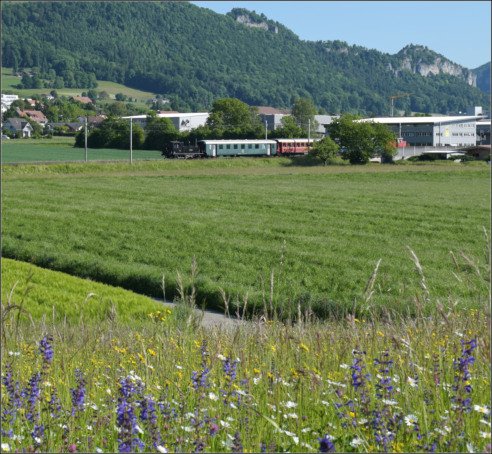 Eb 2/4 35 der Jura-Simplon fährt am Morgen wie die Bahnfreunde auch zum Jubiläumsfest. Bei Niederbipp geht es durch bunte Blumenwiesen. Balsthal, Mai 2025.