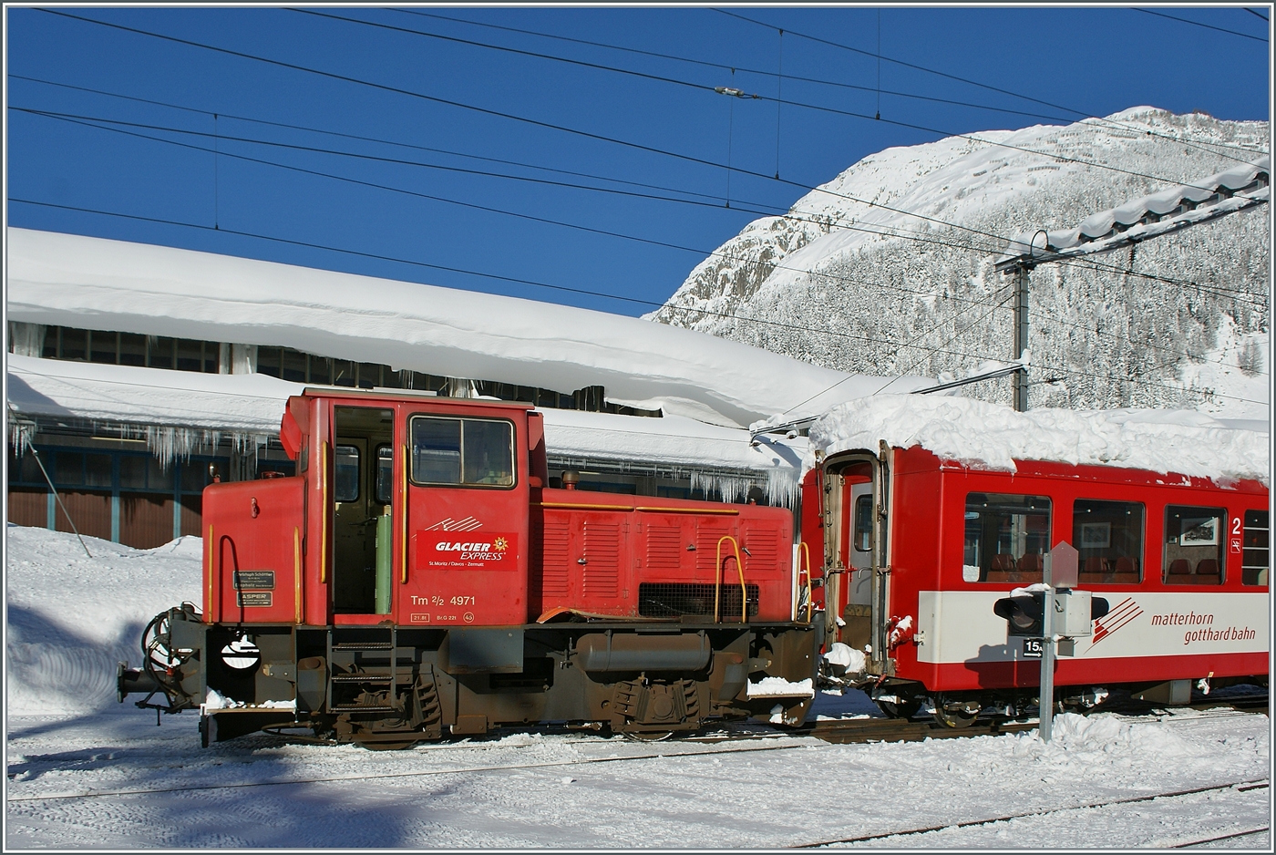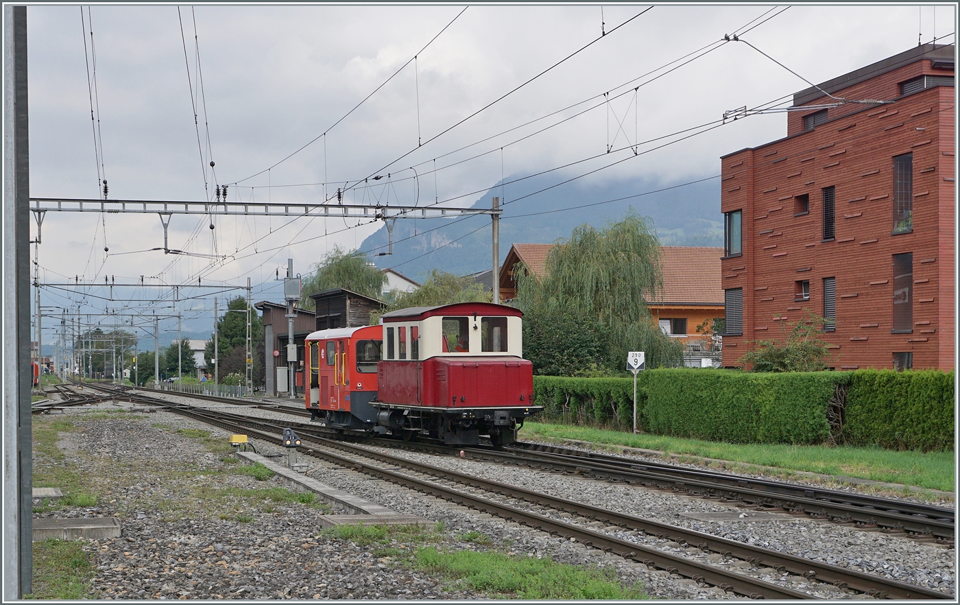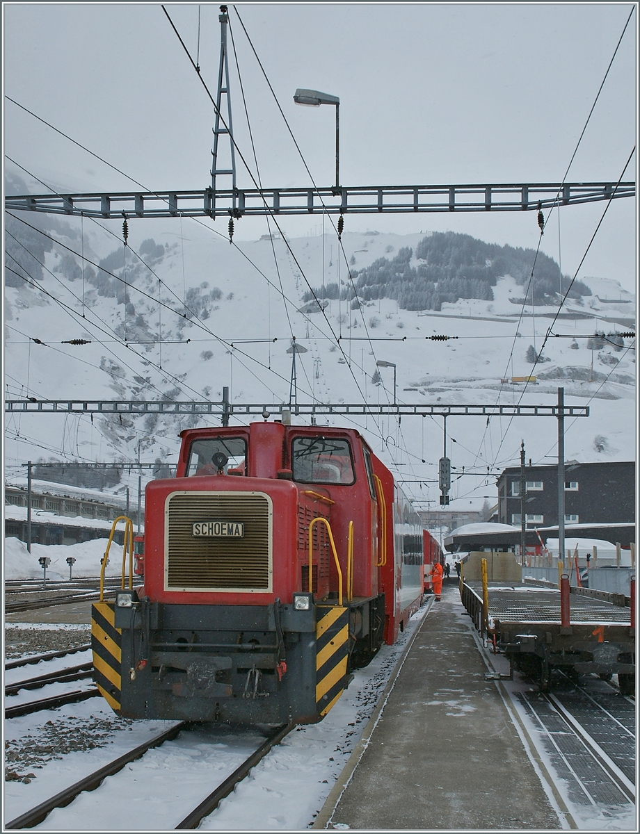 Tm 2/2 - 6 der MOB (Montreux–Berner Oberland-Bahn) steht am 28.05.2012, mit dem vierachsige Flachwagen Baudienst X 46 (ex Rko 822, Baujahr 1914) im Bahnhof Saanen.