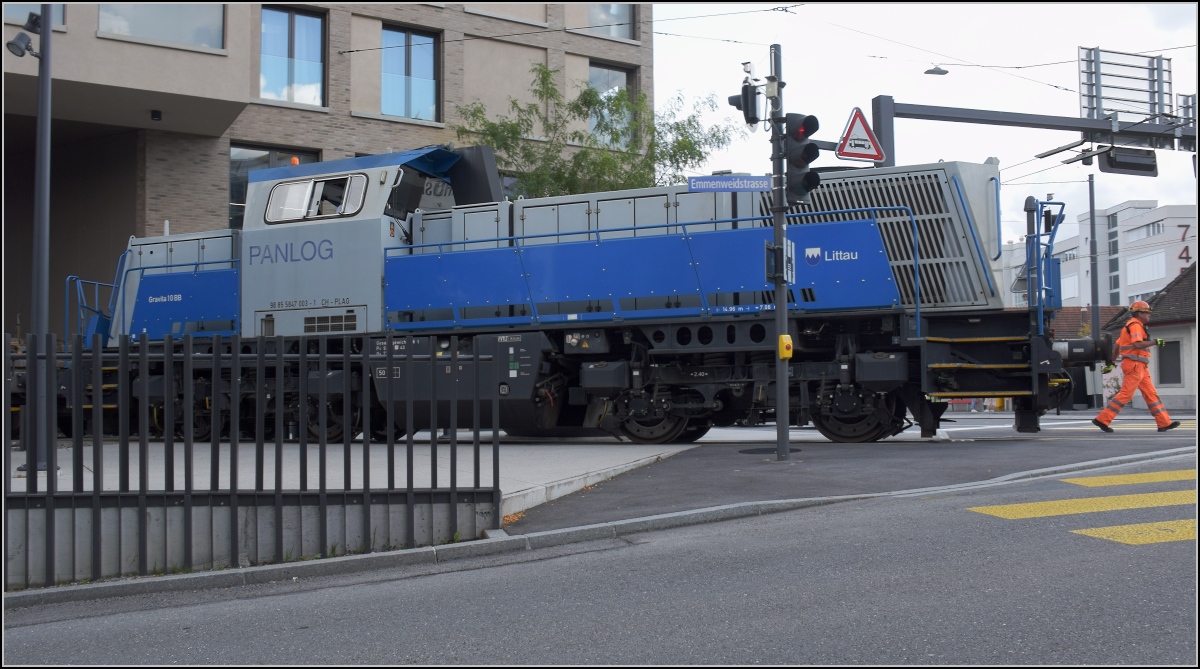 Angesichts der offensichtichen Freude am Jubiläumsfest der Emmentalbahn ist zu vermuten, dass die beiden Gravitas Em 847 004 und Em 847 005 nicht ganz zufällig vor dem Stahlwerk Spalier standen, um die Werks-Veteranin zu salutieren. Gerlafingen, Mai 2025.