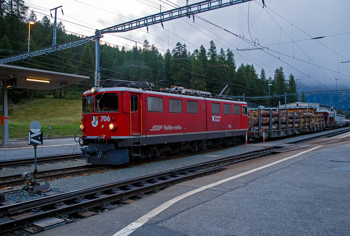Und siehe da, es kam doch ein Güterzug: Die RhB Ge 6/6 II 706  Disentis/Mustér  kommt am 12.09.2017 um 19.30 Uhr mit einem Güterzug im Bahnhof Pontresina an.