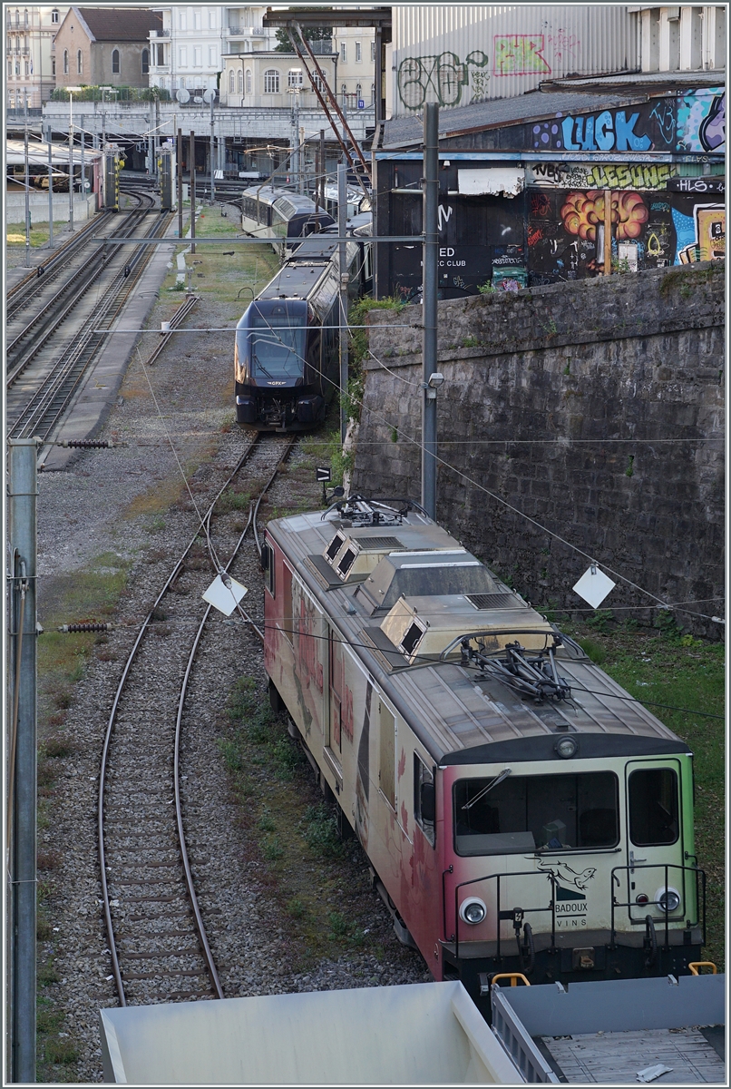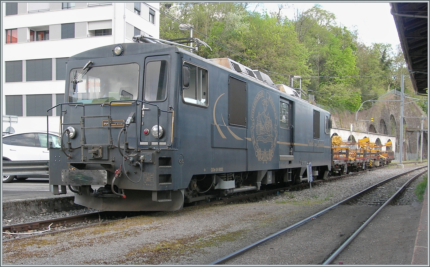 Die MOB GDe 4/4 6002 wartet mit zwei neuen vierachsigen Flachwagen auf dem Streckenast von Chamby in Blonay auf die Weiterfahrt.