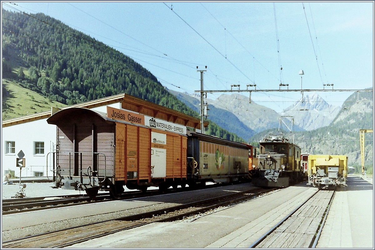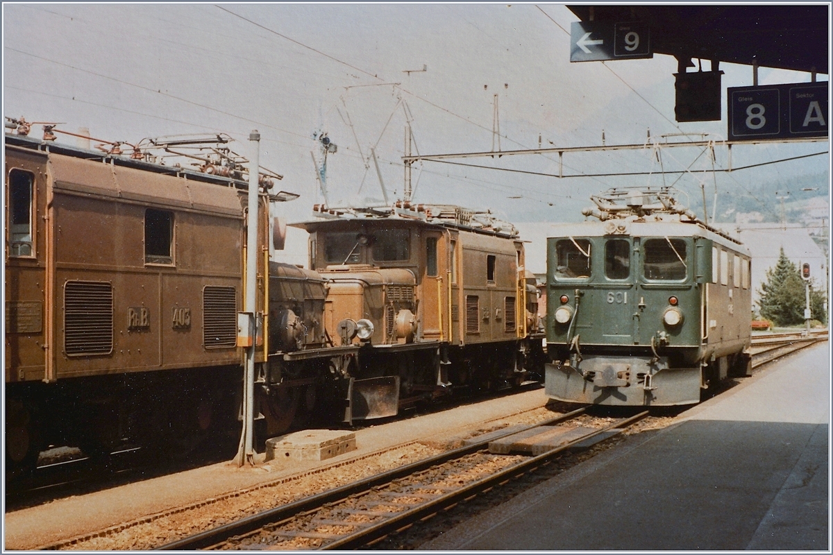 Die Rhb Ge 4/4 601 fährt in Chur an den beiden wartenden Ge 6/6 405 und 411 vorbei. 20. August 1984