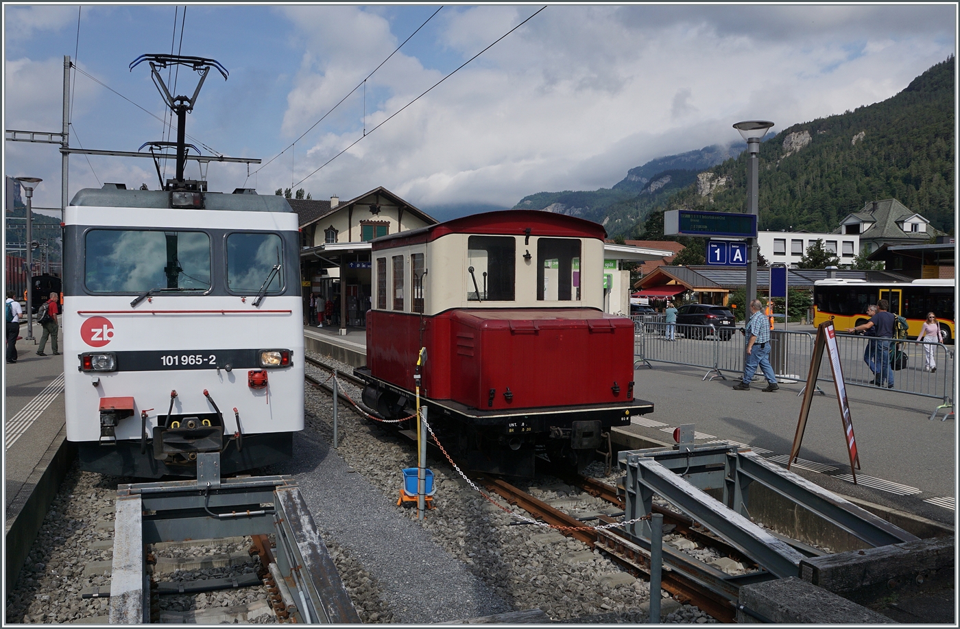 Die MGB HGe 4/4 103 mit einem Regionalzug nach Disentis im zur Zeit durch Umbauarabeiten etwas eingeschränkt zu benutzenden Bahnhofs von Andermattt .