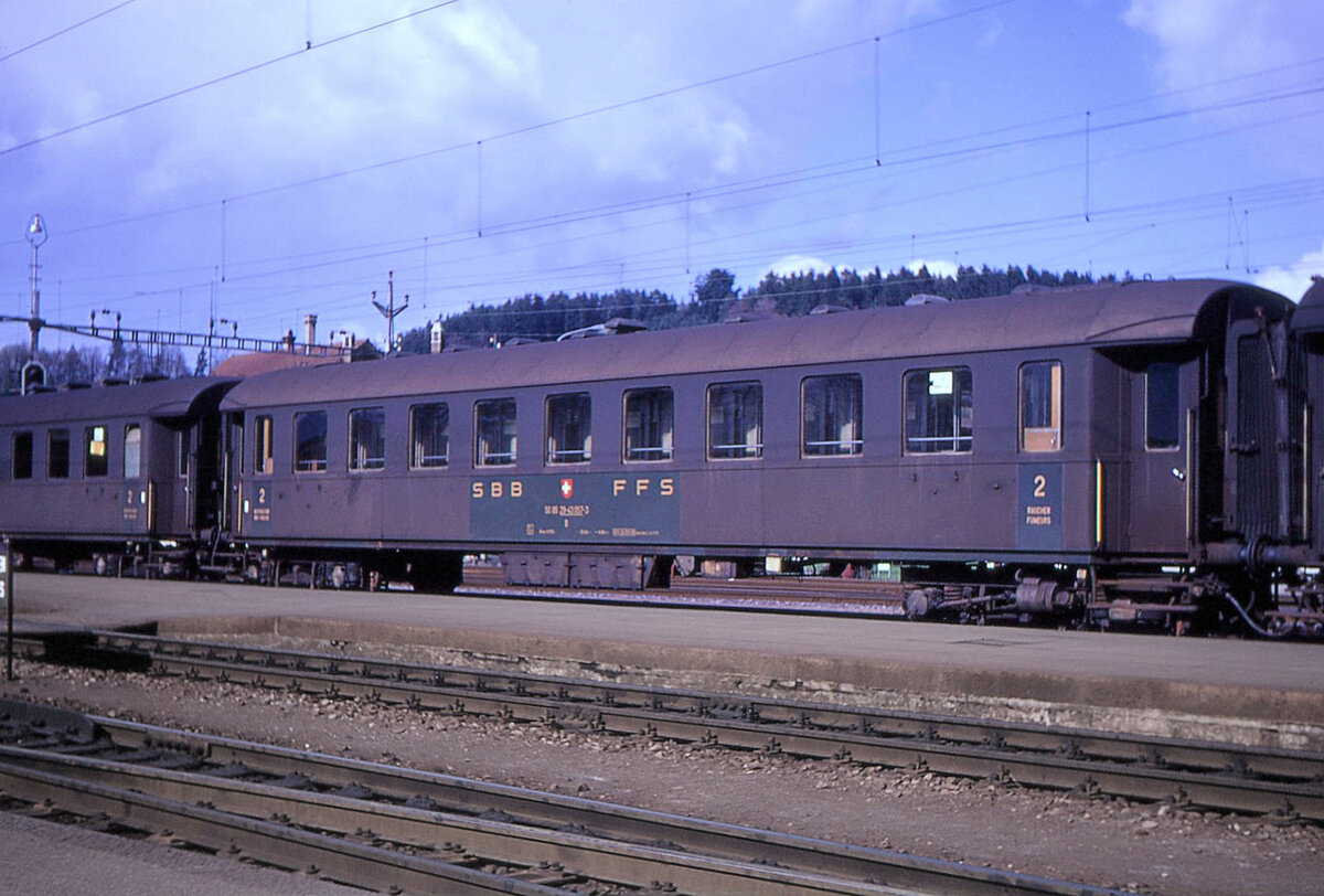 SBB Altbauwagen: Einfahrt in Genève eines Zuges mit Ae3/6 I-110 10692. An erster Stelle ein Altbauwagen, wahrscheinlich ein geschweisster Wagen Serie 7664...7699 (20-03 262...297) von 1932-1935. 13.Juli 1965