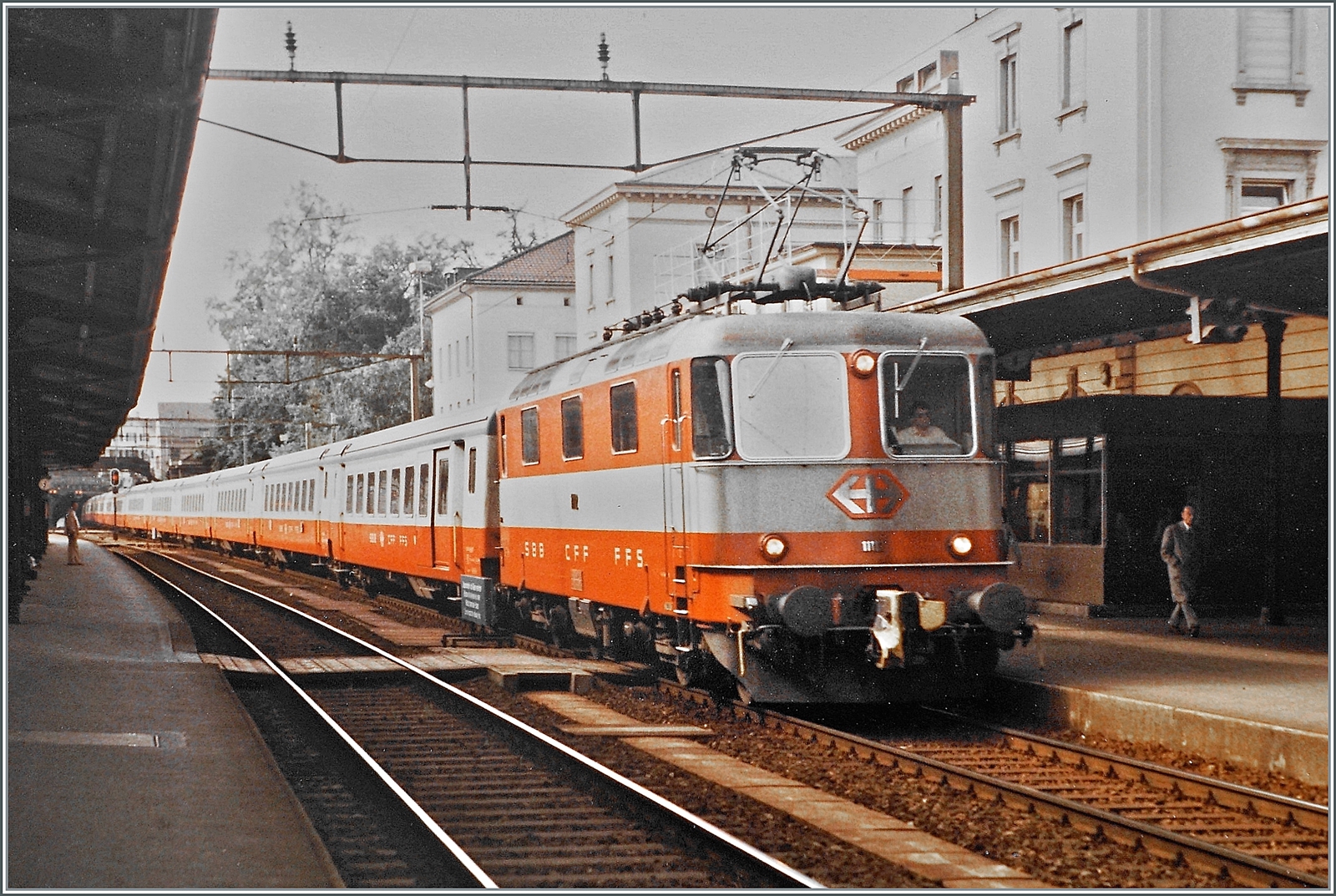 Die SBB Ae 3/6 I 10696 ist mit ihrem Schnellgutzug in Aarau angekommen. Im Hintergrund ist der WSB Bahnhof zu sehen.