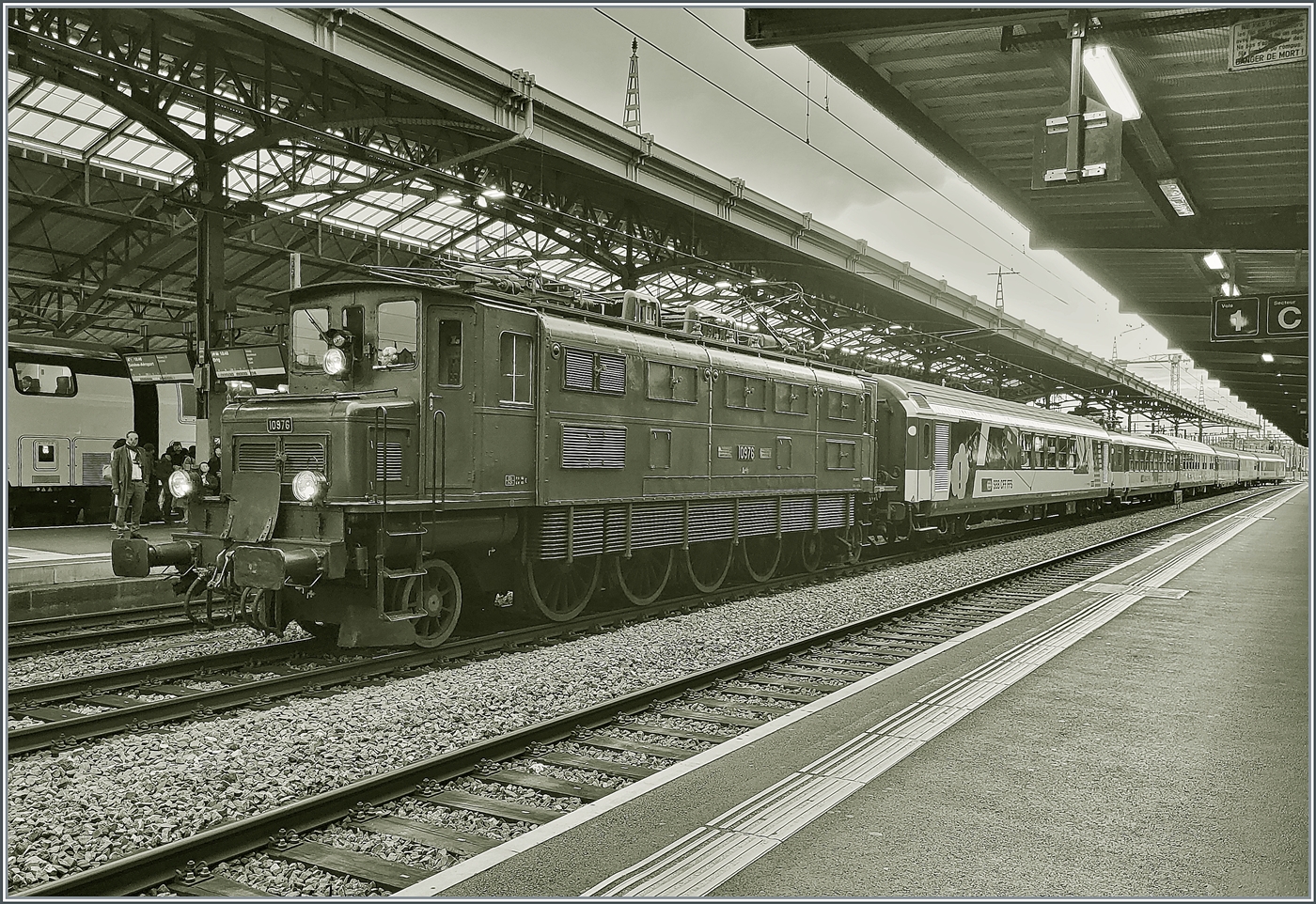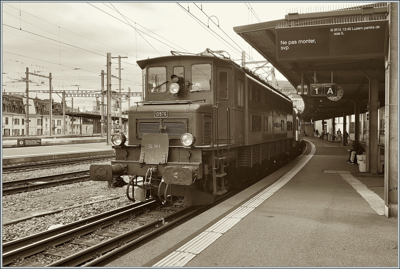 Vouvry vor einigen Jahren mit der SBB Ae 4/7 10960 mit ihrem "GmP" (ohne Güterlast) auf der Fahrt von Bouvert nach St-Maurice beim etwas längeren Halt in Vouvry.