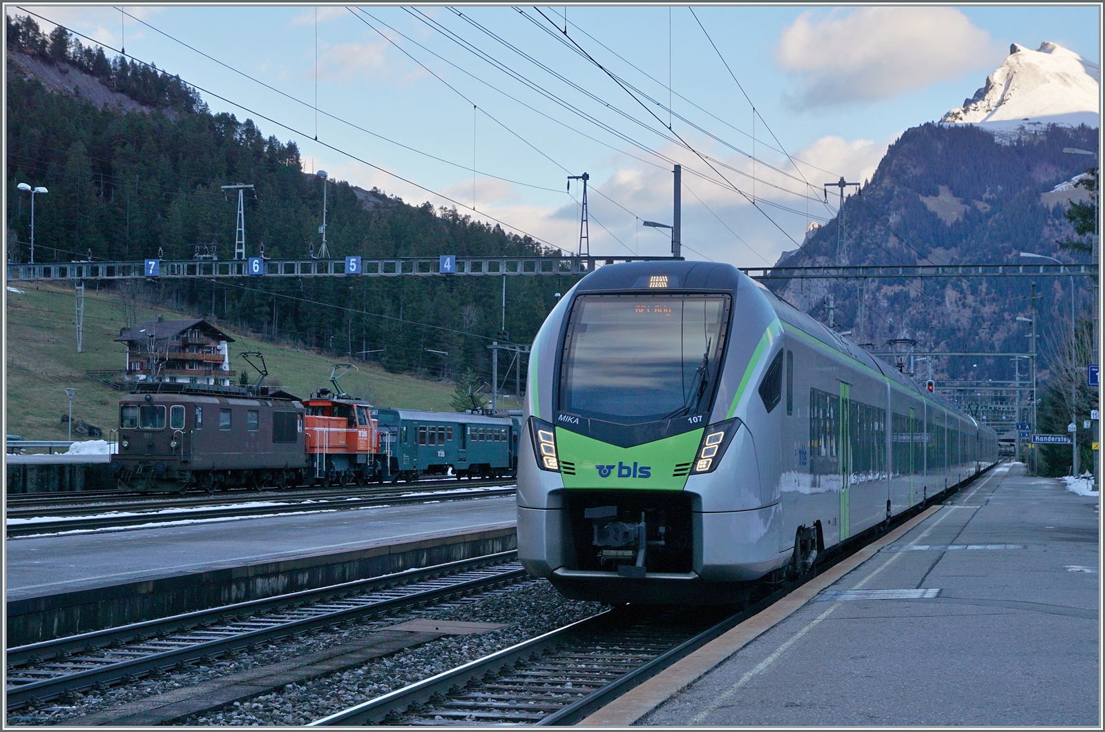 Damit man die von Peter angesprochene "leidige grüne Farbe" der BLS Ae 4/4 besser vorstellen kann, habe ich die Ae 4/4 251 in Kandersteg beim "100 Jahre BLS" Nordrampenfest etwas in die Zeit zwischen 1949 - 1955 (?) zurückversetzt. Zudem "fährt" die Lok hier optisch in die falsche Richtung (auf den Betrachter zu und nicht von im weg).