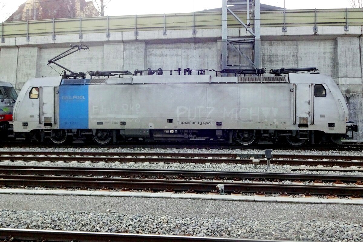Mit einem Güterzug Richtung Gotthard ist Railpool 186 107 am 15.09.2016 in Sisikon unterwegs