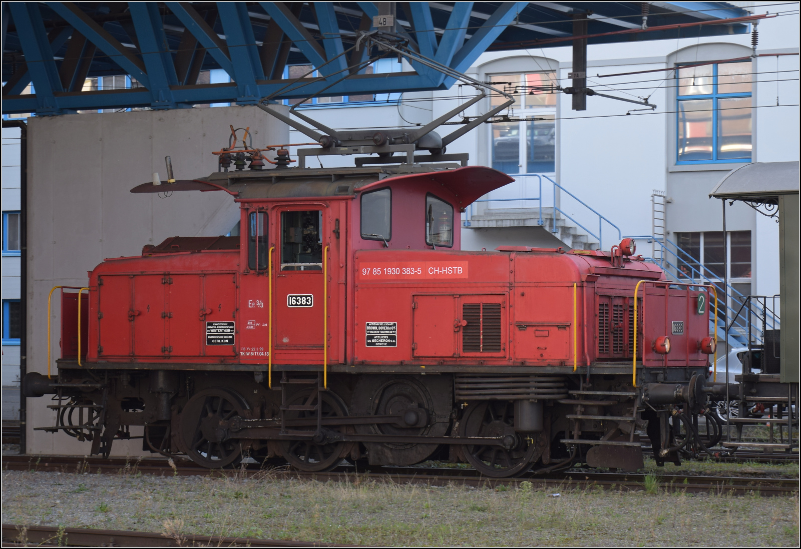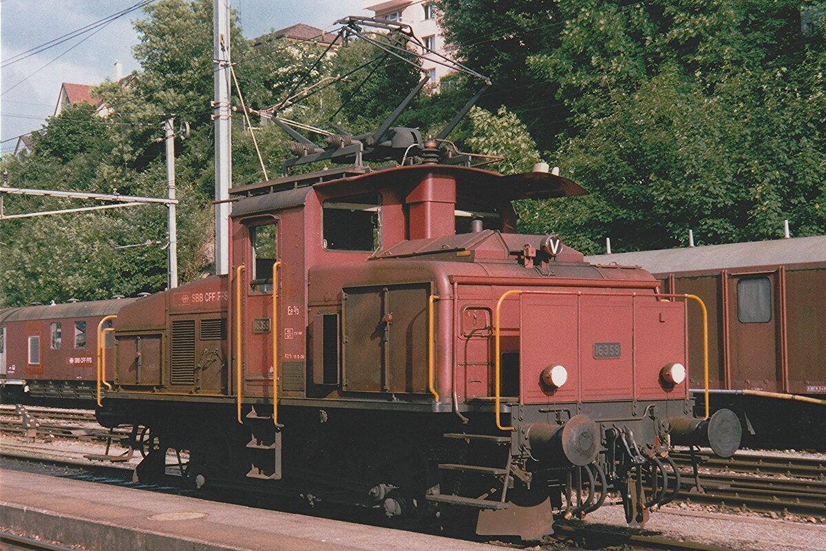 Froschblick auf Elektroverschiebelokomotive 16388 mit ein aus das Depot gekommener Pendelzug in Bahnhof Olten am 21 Mai 2022 anlasslich das 175.Jahresjubiläum der Eisenbahnen in die Schweiz. Leonardus Schrijvers