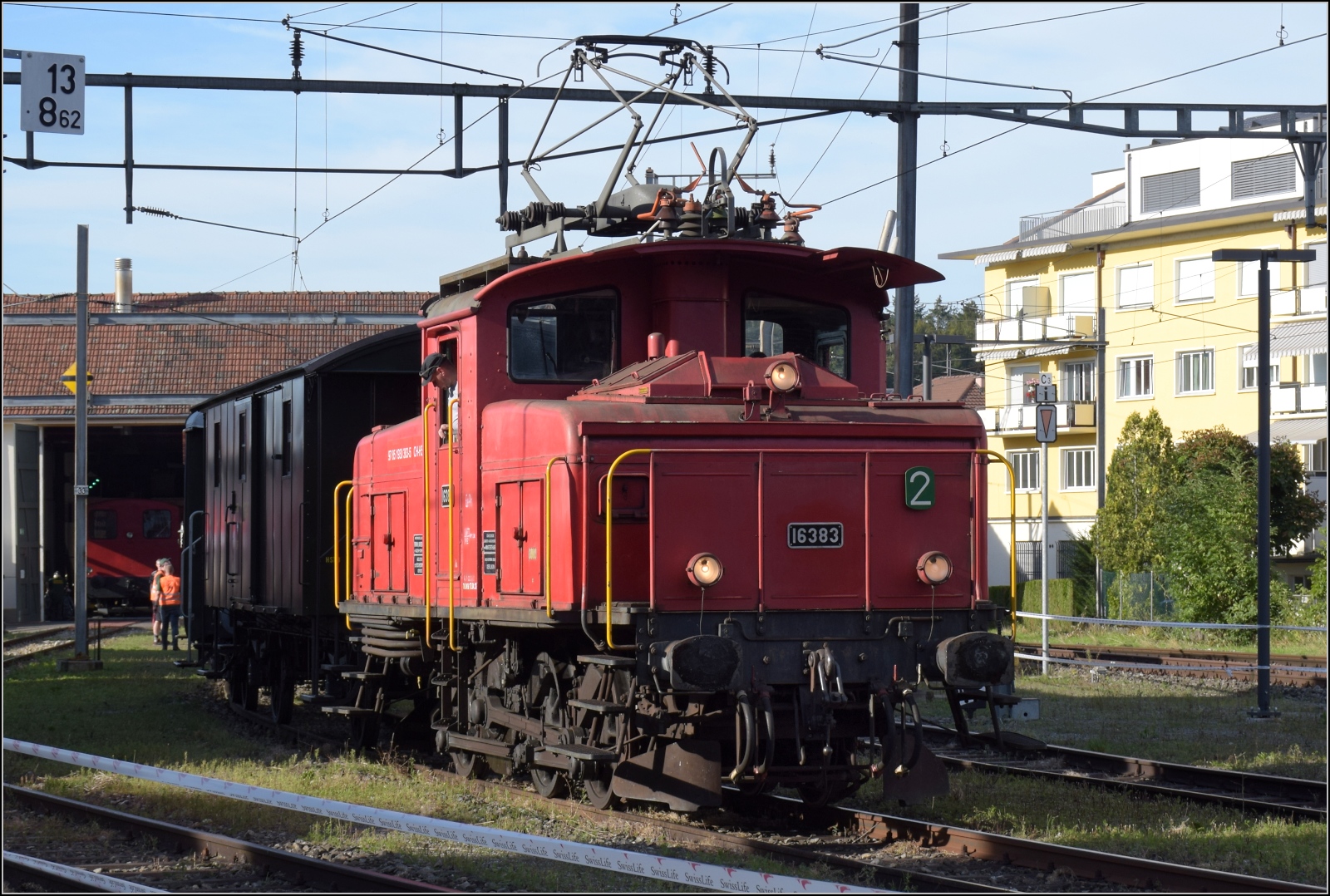 Froschblick auf Elektroverschiebelokomotive 16388 mit ein aus das Depot gekommener Pendelzug in Bahnhof Olten am 21 Mai 2022 anlasslich das 175.Jahresjubiläum der Eisenbahnen in die Schweiz.