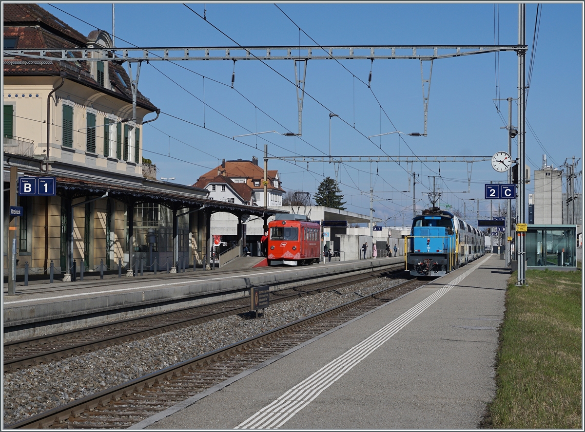 Während rechts im Bild der Stadler Eea 936 133-8 mit einem sechsteiligen Westbahn "Kiss 2" auf dem Weg in Richtung St. Margrethen in Rheineck durchfährt, wartet links im Bild der der AB RhW BDeh 1/2 auf die Abfahrt nach Walzenhausen. 23. März 2021 23. März 2021