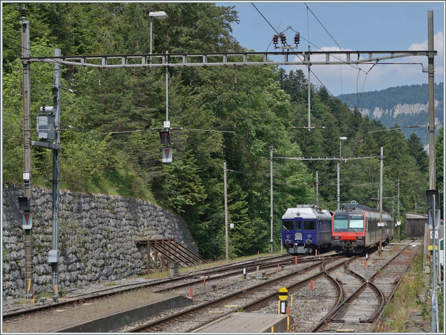 Hier noch die farbige Variante eines bereits bekannten Bildes: Die SMB Re 4/4 III 181 wartet mit ihrem Regionalzug nach Solothurn in der Zugsausgangsstation Moutier auf die Abfahrt.