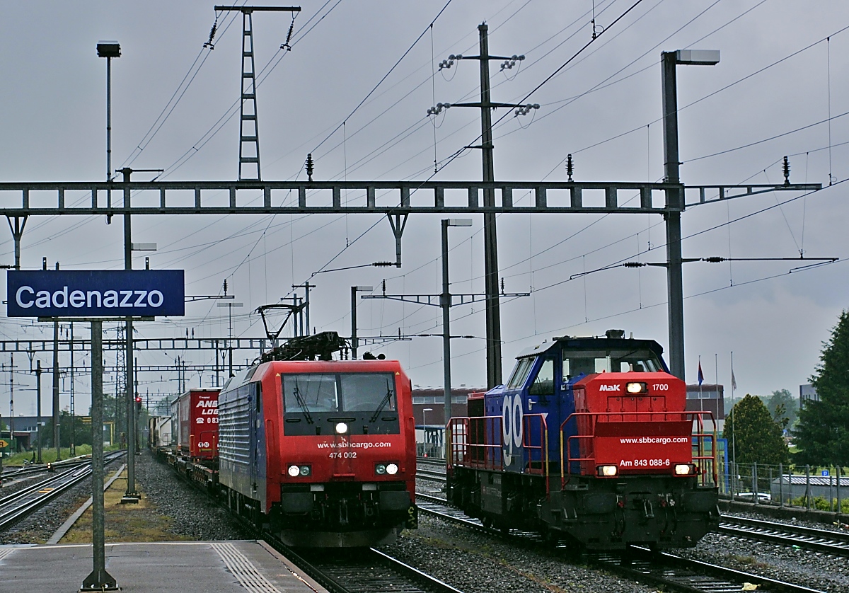 Abwechslungsreiche 17 Minuten in Cadenazzo: Um 17.43 Uhr liefern sich 474 002 und Am 843 088-6 ein Wettrennen, das klar zugunsten der 474 ausging (08.05.2019)