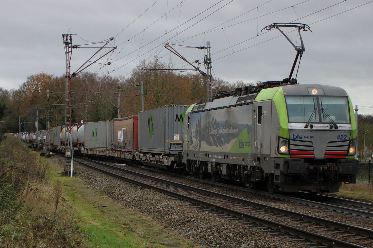 Die recht neue BLS Cargo 418 – Re 475 421-4 (91 85 4475 421-4 CH-BLSC) fährt am 07.05.2021 mit einem KLV-Zug durch den Bahnhof Betzdorf (Sieg) in Richtung Köln.
