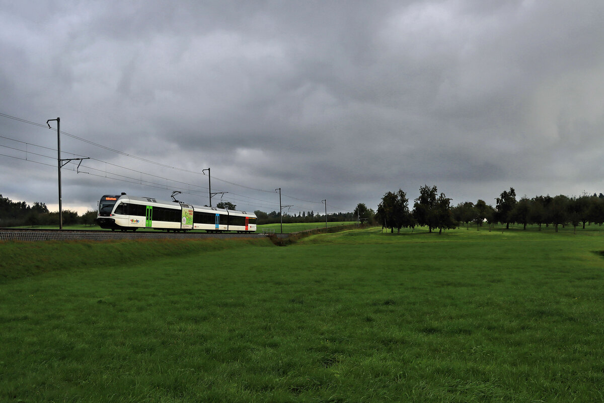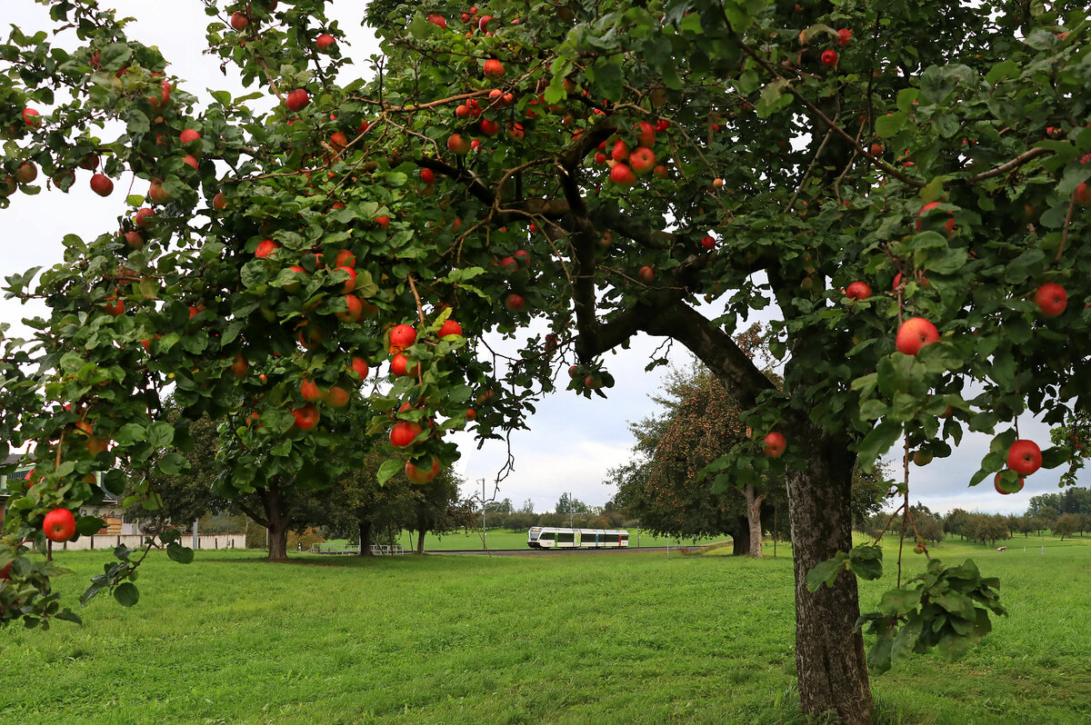 An der ehemaligen BT-Strecke Romanshorn - St.Gallen: Ein schwerer Tankwagenzug wird von den beiden Loks Re 4/4 11242 und Re 6/6 11670 über den Berg nach St.Gallen geschleppt. Muolen, 7.Oktober 2021